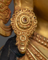 The Sacred Manjushri With Sword Of Wisdom, stands at a height of 12.6 inches (32 cm) with a base width of 8.9 inches (22.5 cm), making it a striking presence in any sacred space. Crafted with a copper body, the statue is adorned with 24K gold gilding, enhancing its spiritual and aesthetic significance. The intricate gold and acrylic paintings on the statue further highlight its detailed craftsmanship, emphasizing Manjushri's serene and wise expression.