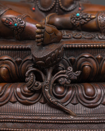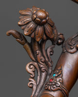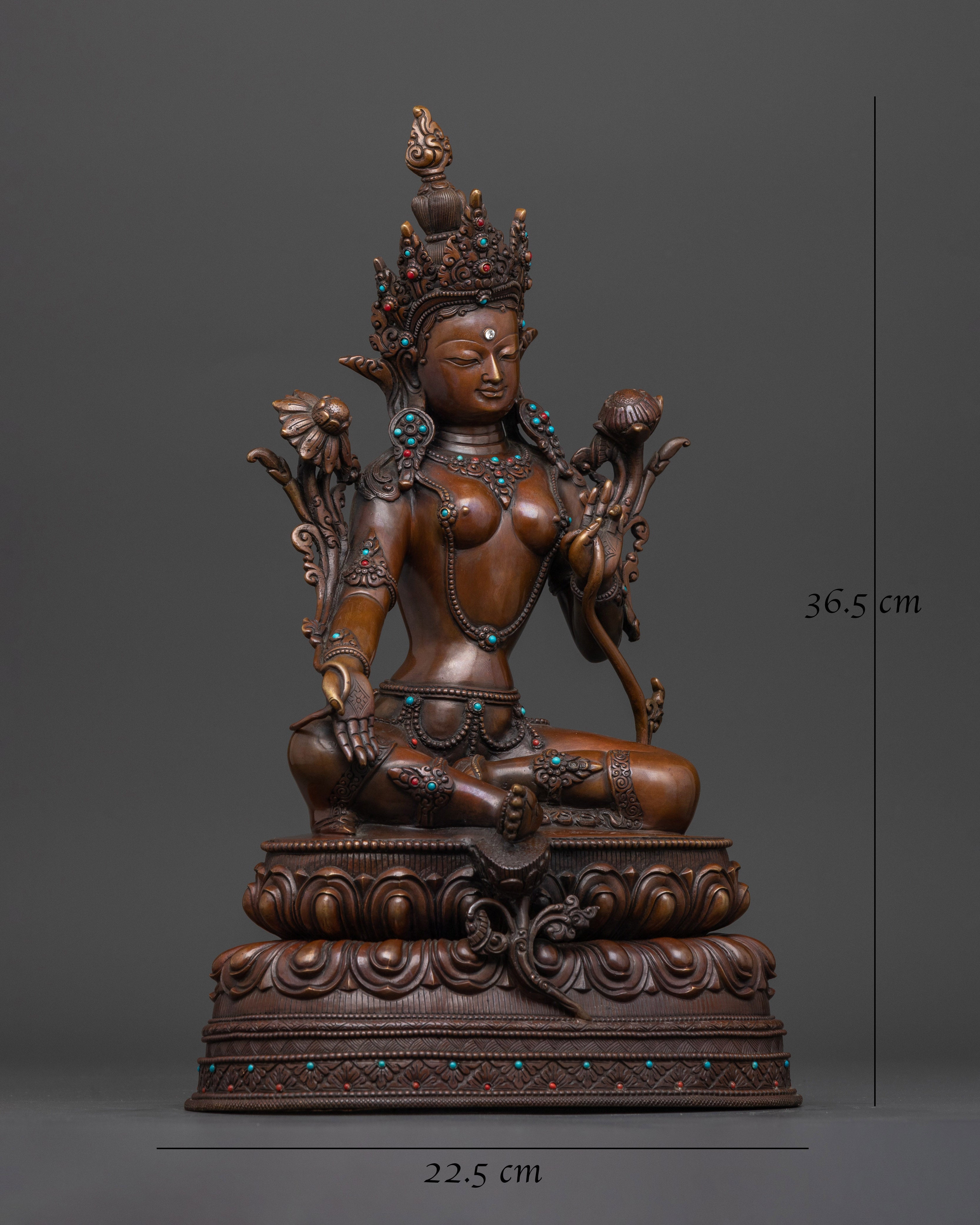 Standing at 14.4 inches in height, Green Tara is depicted seated with one leg extended, symbolizing her readiness to act on behalf of those in need. Her right hand is in the varada mudra (gesture of granting boons), representing her willingness to offer protection and blessings, while her left hand holds a blue lotus (utpala), signifying purity and spiritual enlightenment. Her serene expression reflects both compassion and wisdom.
