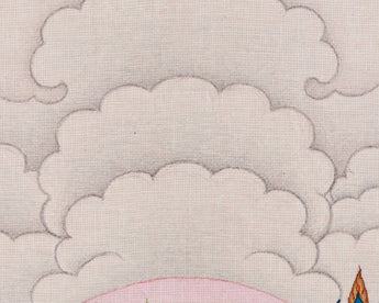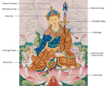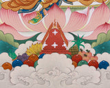 Step into the sacred presence of the Teacher of the Dharma, Guru Rinpoche, through a divine thangka that beautifully captures his wisdom, power, and spiritual guidance. Hand-painted in our Enlightenment Studio, this thangka is meticulously made on high-quality cotton canvas with natural Lhasa stone colors and genuine 24K gold. The artwork is a spiritual masterpiece that uplifts and inspires your space with its divine energy. It showcases a distinctive background that accentuates Guru Rinpoche's sacred presence, with gentle clouds surrounding him in a calm, protective setting.