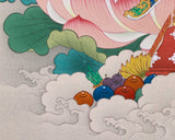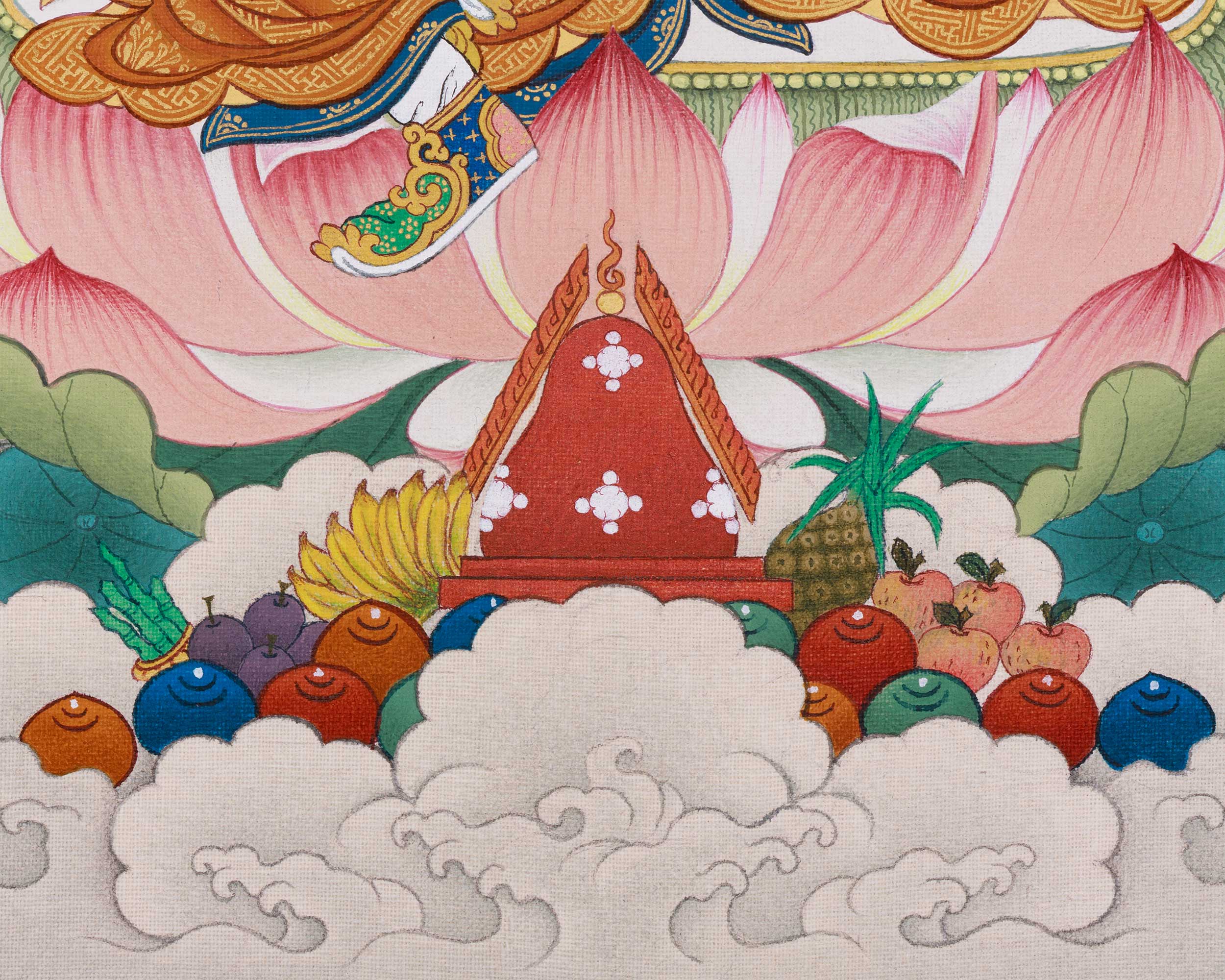 The background of this thangka features soft, ethereal clouds that create a peaceful setting for Guru Rinpoche’s powerful image, making it a distinctive and vibrant work of art. The use of 24K gold amplifies his divine glow, while the offerings at the bottom represent the spiritual wealth and blessings Guru Rinpoche grants his followers. This thangka is not only a beautiful piece but also a spiritual tool that reminds viewers of the transformative teachings and blessings Guru Rinpoche provides. It is an ideal addition to any space dedicated to wisdom, protection, and spiritual growth.