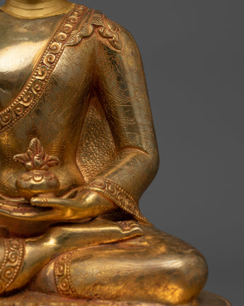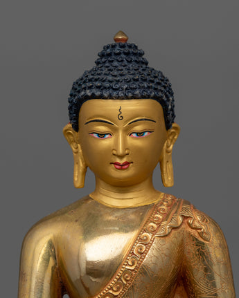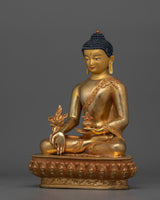 The Three Buddha Set Statues, which represent healing, enlightenment, and boundless compassion, are a revered trio that include Medicine Buddha, Shakyamuni Buddha, and Amitabha Buddha. Standing at 10.8 inches (27.5 cm) tall, each statue is precisely made from a copper body and enhanced with bright 24K gold gilding, giving a harmonious blend of artistry and divine meaning. Each statue's 7.7-inch (19.5 cm) base offers durability and elegance, while the fine craftsmanship, highlighted by gold and acrylic paintings, showcases the Buddhas' tranquil and compassionate expressions.
