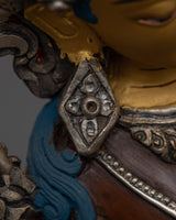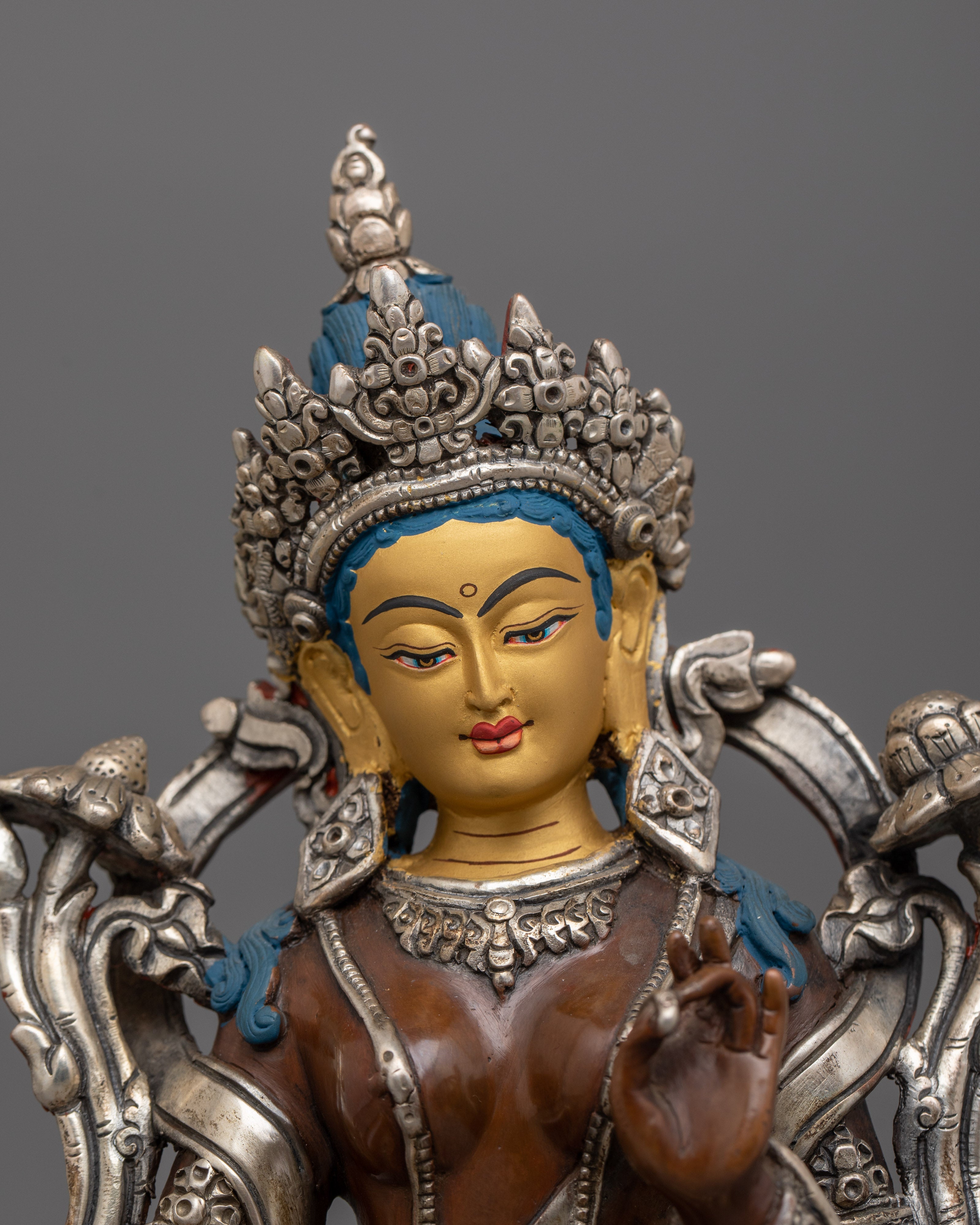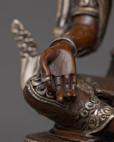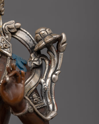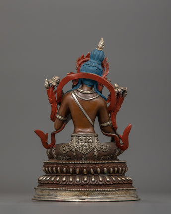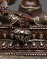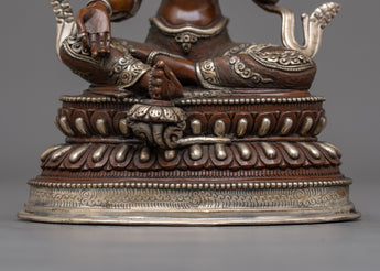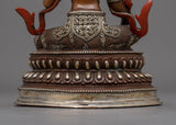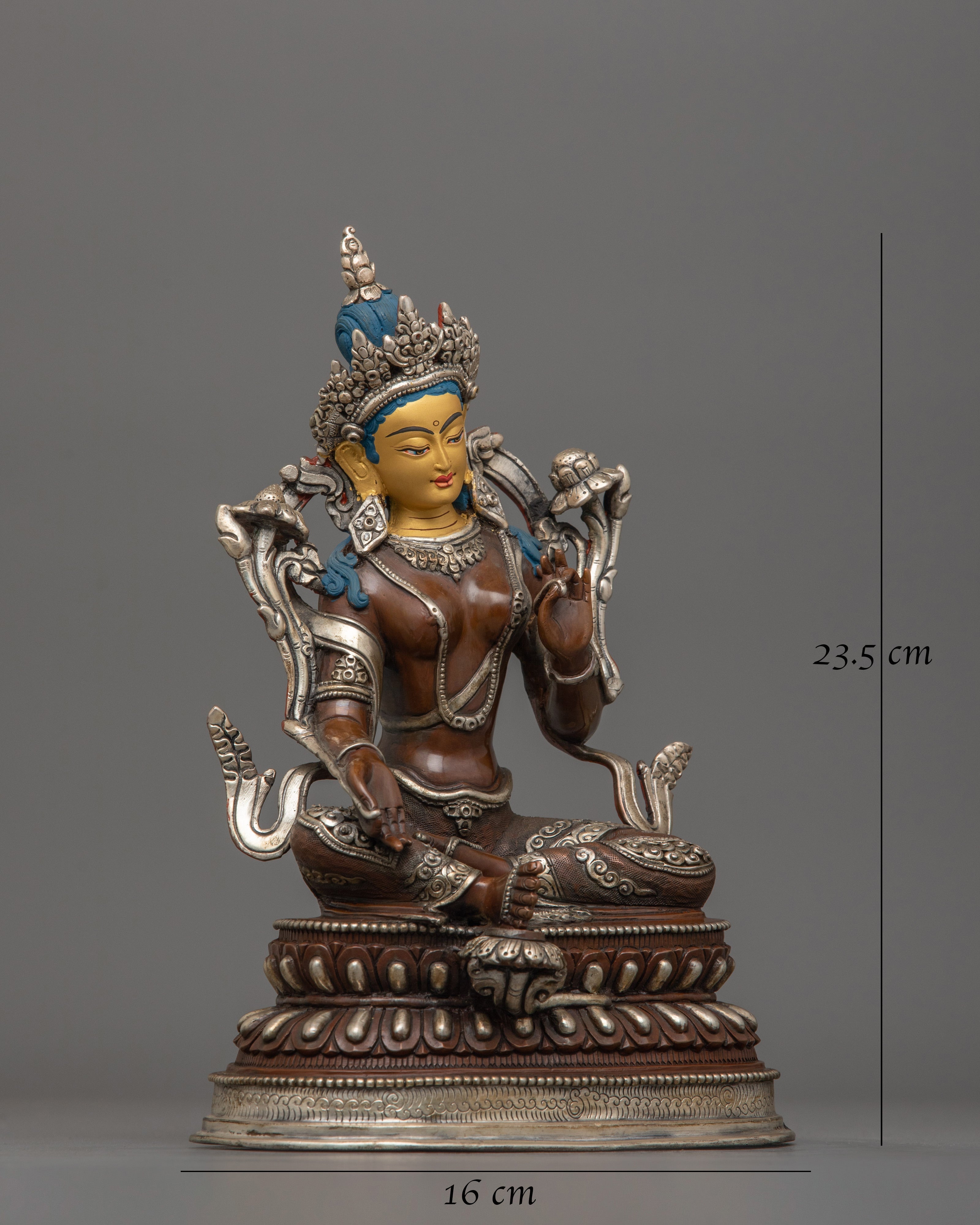 This statue is made by hand in Nepal from oxidized copper and is embellished with elaborate acrylic and gold paintings whether used as a meaningful gift or for one's spiritual practice, this Green Tara statue captures the spirit of enlightenment, compassion, and liberation.