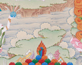 Created in our Enlightenment Studio, this Three Bodhisattvas: Chenrezig, Manjushri & Vajrapani thangka embodies compassion, wisdom, and power—the divine qualities of enlightenment. Painted on fine cotton with natural stone pigments and 24K gold, it radiates earthly depth and celestial brilliance. The mineral-based pigments ensure vibrancy and purity, while gold detailing highlights divine forms. Executed in the Karma Gadri style, known for spacious landscapes and soft gradients, this masterpiece merges traditional Tibetan workmanship with spiritual devotion.