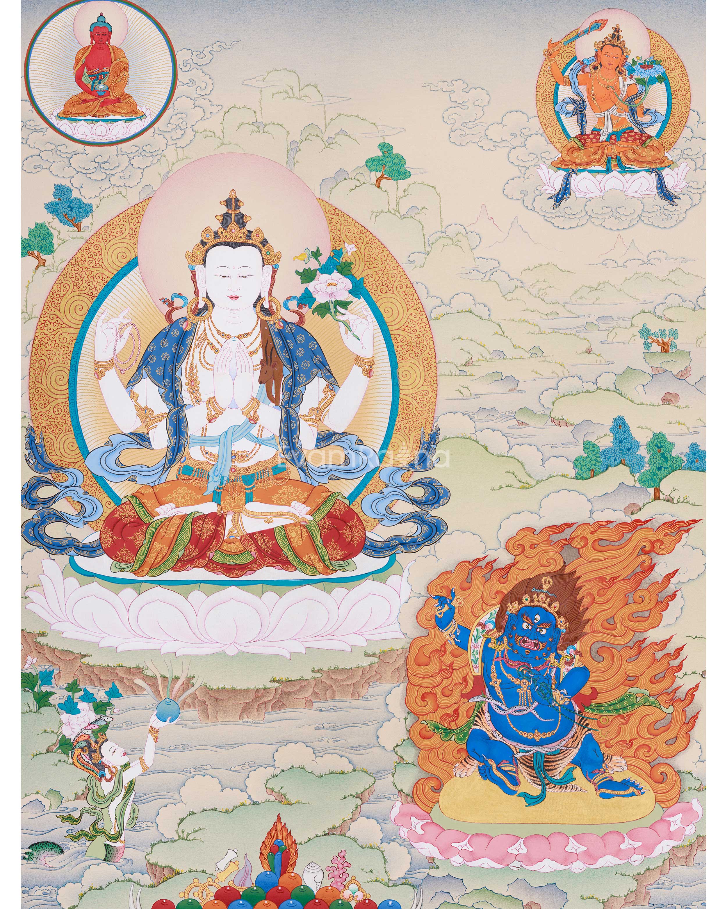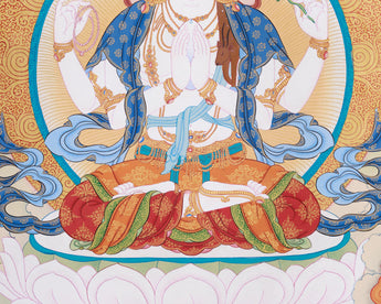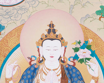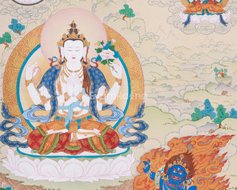 Chenrezig (Avalokiteshvara), the Bodhisattva of Infinite Compassion, sits gracefully on a radiant lotus at the center of the painting. His four arms symbolize his vow to aid all beings—two hold a wish-fulfilling jewel, symbolizing compassion. Conversely, the remaining figures hold a crystal rosary and a lotus flower, symbolizing devotion and purity. His calm expression and luminous halo exude serenity, embodying infinite compassion that transcends suffering.