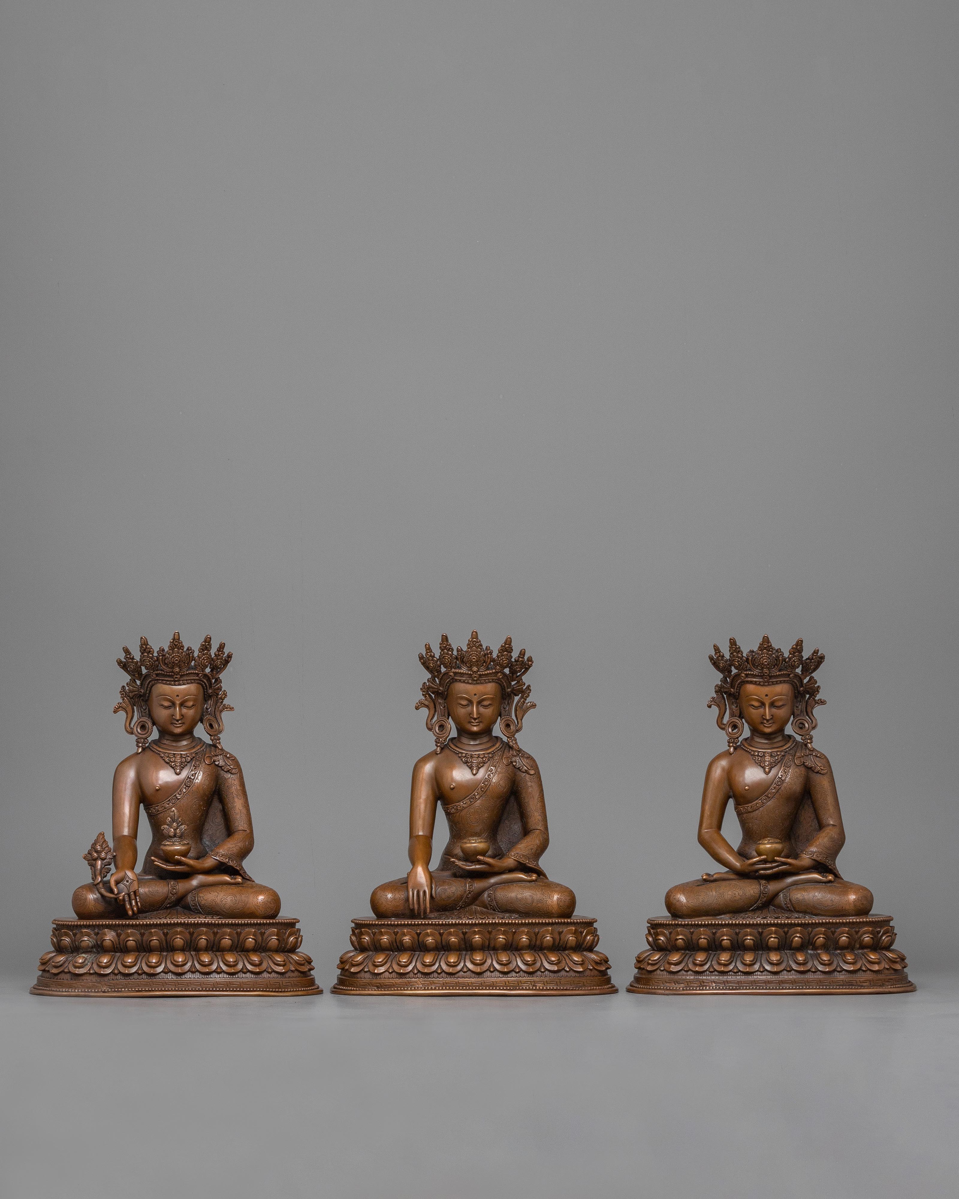 Three-Crown Buddha Set | Oxidized Copper Trio of Healing, Wisdom, and Infinite Light