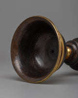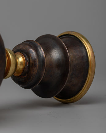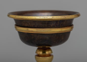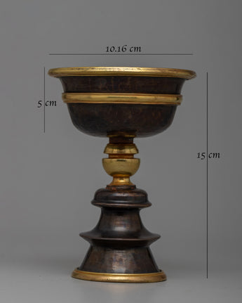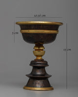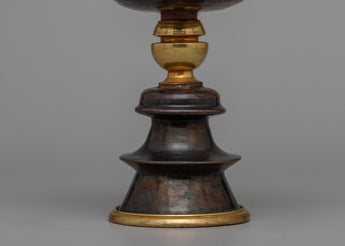 With its exquisite handiwork on an oxidized copper body and gold plated, the Tibetan Butter Lamp Set will envelop your sacred area in an ethereal radiance. This set strikes the ideal combination of practicality and visual appeal, measuring 15 cm in height, 10.16 cm in Diameter, and 5 cm in inner depth. It weighs 1.02 kg in total and has a calm, spiritual atmosphere.