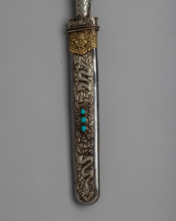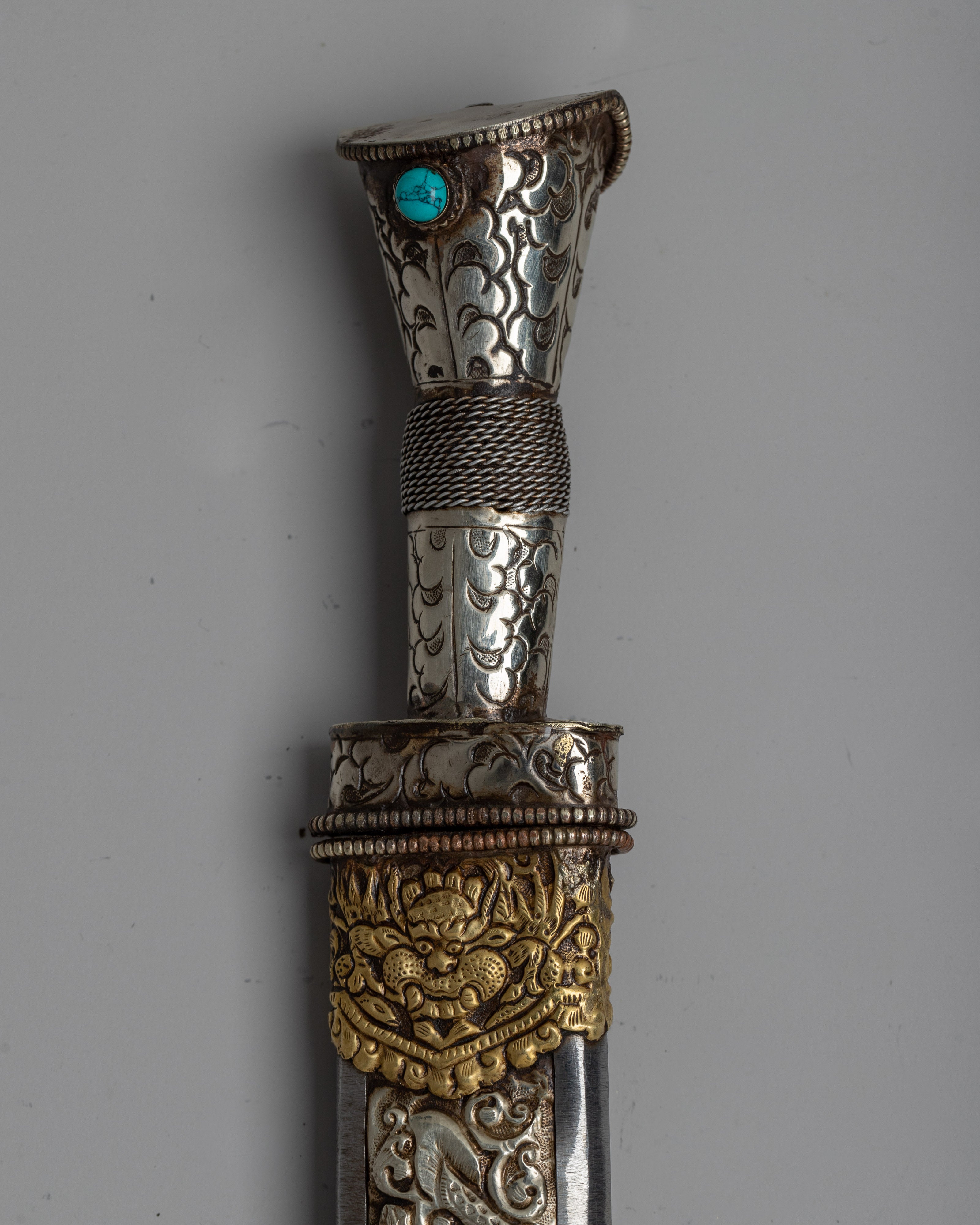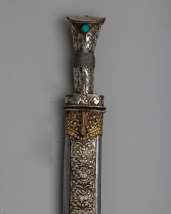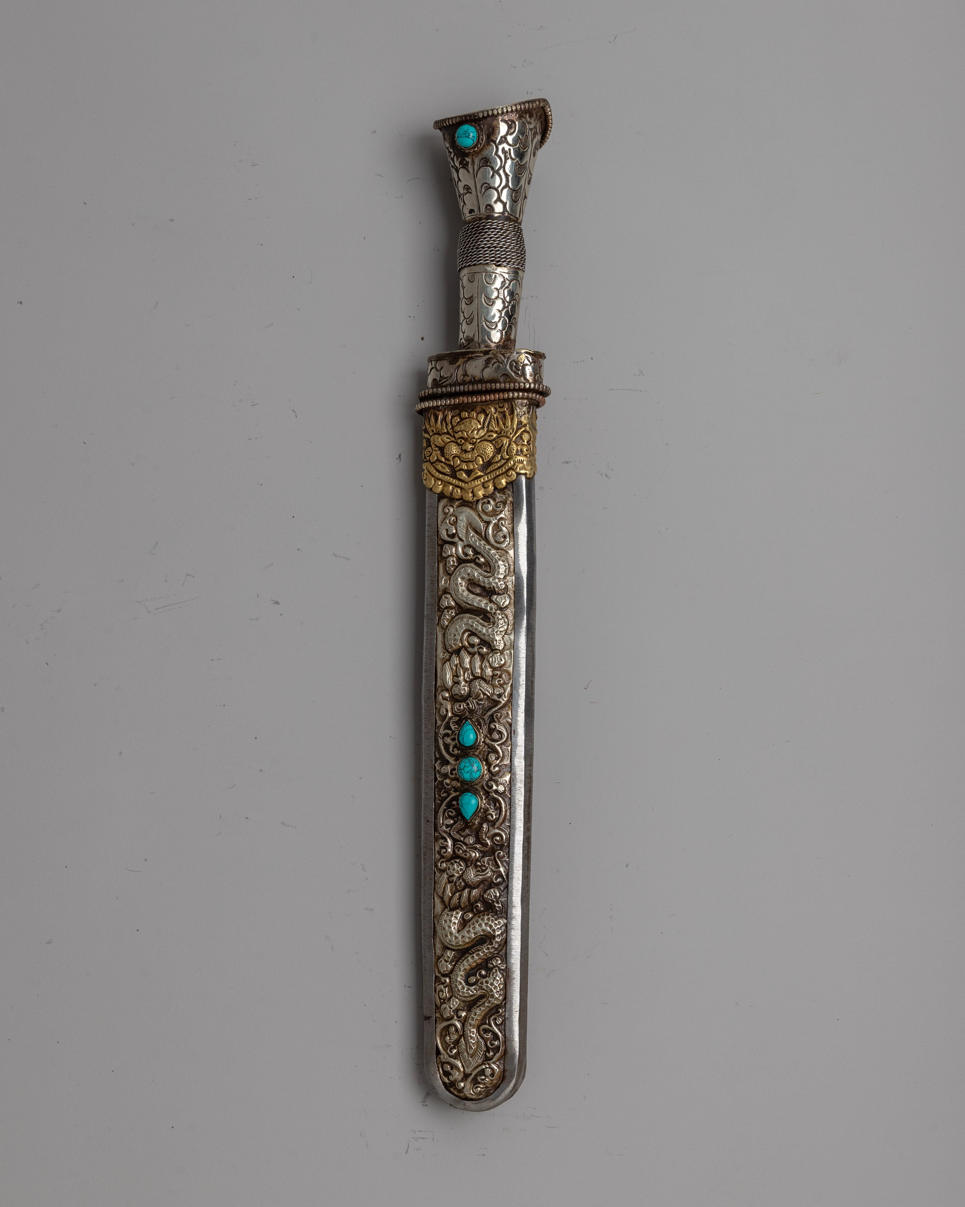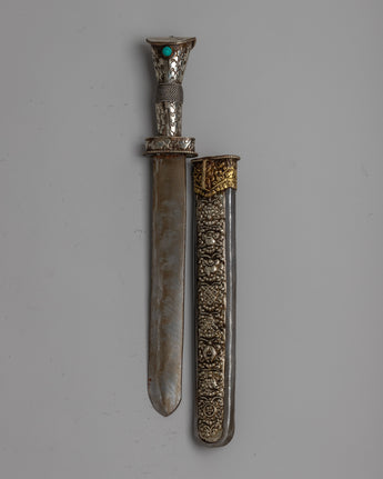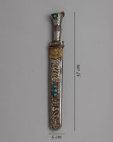 This Tibetan Knife serves as a link to the rich customs and handicrafts of Tibet, serving as more than just a decorative piece. It can be used as a teaching tool or as a representation of the culture's enduring spirit in Tibet. Bring a piece of Tibetan history into your hands with this knife, which is perfect for collectors, cultural enthusiasts, or as a thoughtful gift.