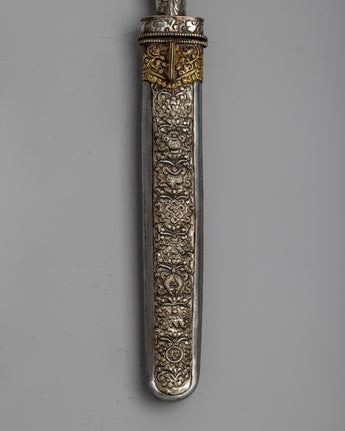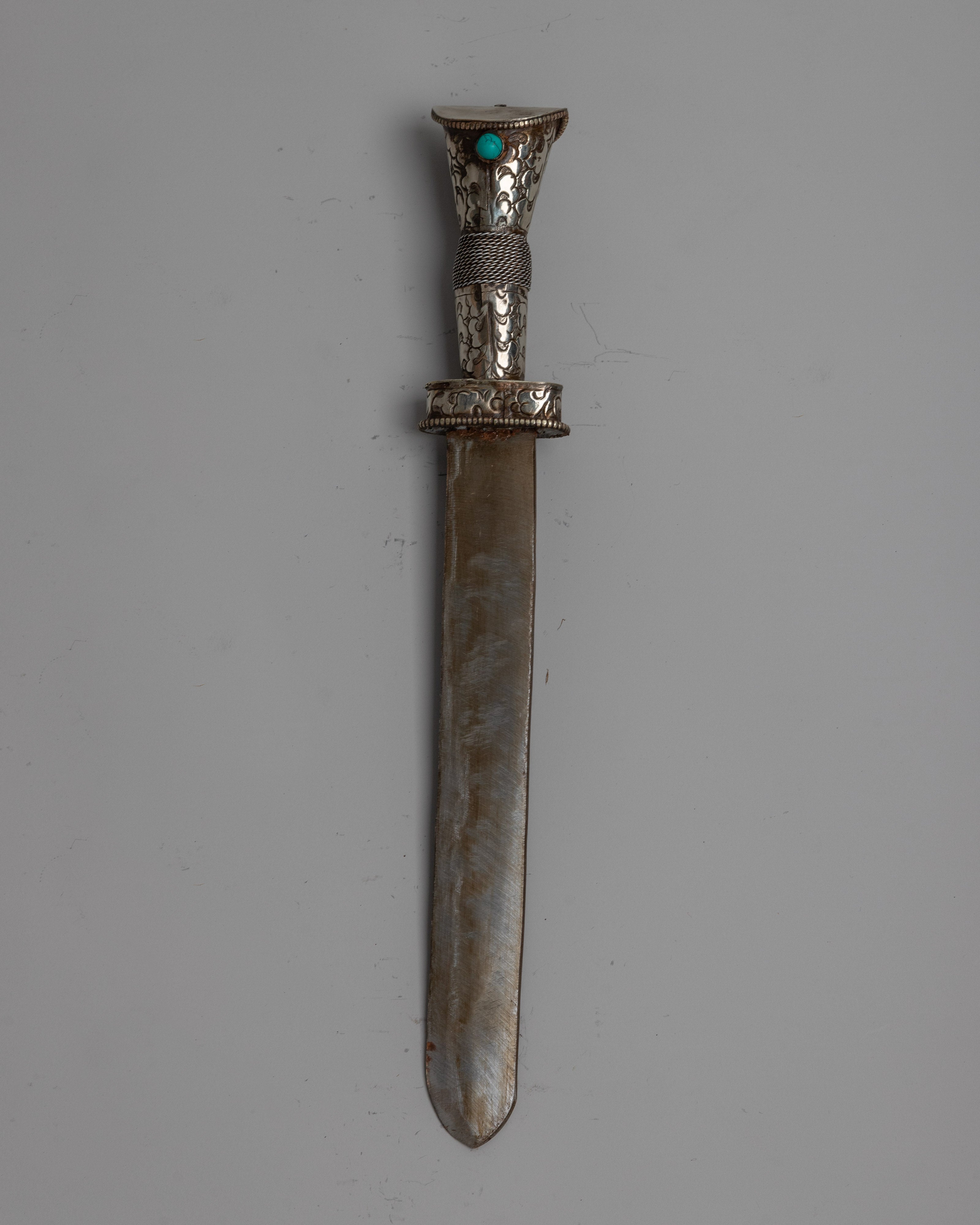 We are pleased to offer our Traditional Tibetan Knife, which is 37 cm tall and carefully crafted of white metal. In Tibetan culture, knives are highly valued for their practicality and symbolic meaning. This knife is an example of that. In addition to offering durability, the knife's use of white metal gives it a distinctive, vintage look.