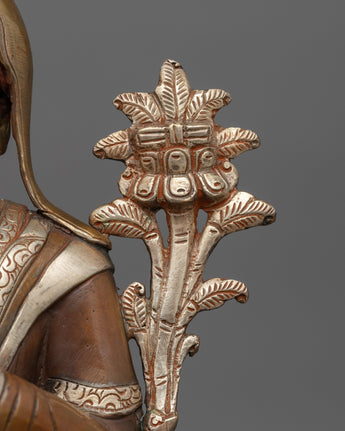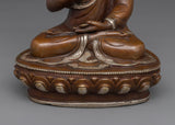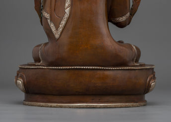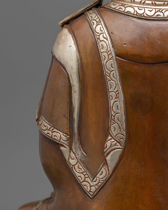 This Tsongkhapa and Disciples Statue Set skillfully depicts the essence of the legendary Tsongkhapa, the founder of Tibetan Buddhism's Gelug school, and his two dedicated followers, Khedrup Je, and Gyaltsab Je. Tsongkhapa stands 13.4"/34cm tall and has a base width of 9.1"/23cm, weighing 3.85kg. Khedrup Je and Gyaltsab Je, on the other hand, stand 11.6"/29.5cm tall with base widths of 8.1"/20.5cm and 7.9"/20cm, respectively, and weigh 2.47kg. The set weighs 9.73 kg and is made of oxidized copper with a silver plated finish, highlighting Patan, Nepal's famous workmanship.