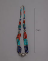 Presenting the exquisitely crafted Tibetan Beads Necklace, which blends traditional workmanship with vivid colors and materials. This necklace is formed of white metal and weighs 0.074 kilogram. It is embellished with artificial stones such as lapis lazuli, coral, and turquoise. The necklace is 29 cm long. The elaborate pattern and thoughtful stone selection are a reflection of Tibetan jewelry's rich artistic and cultural history.
