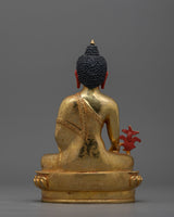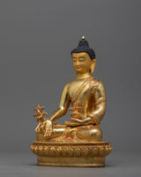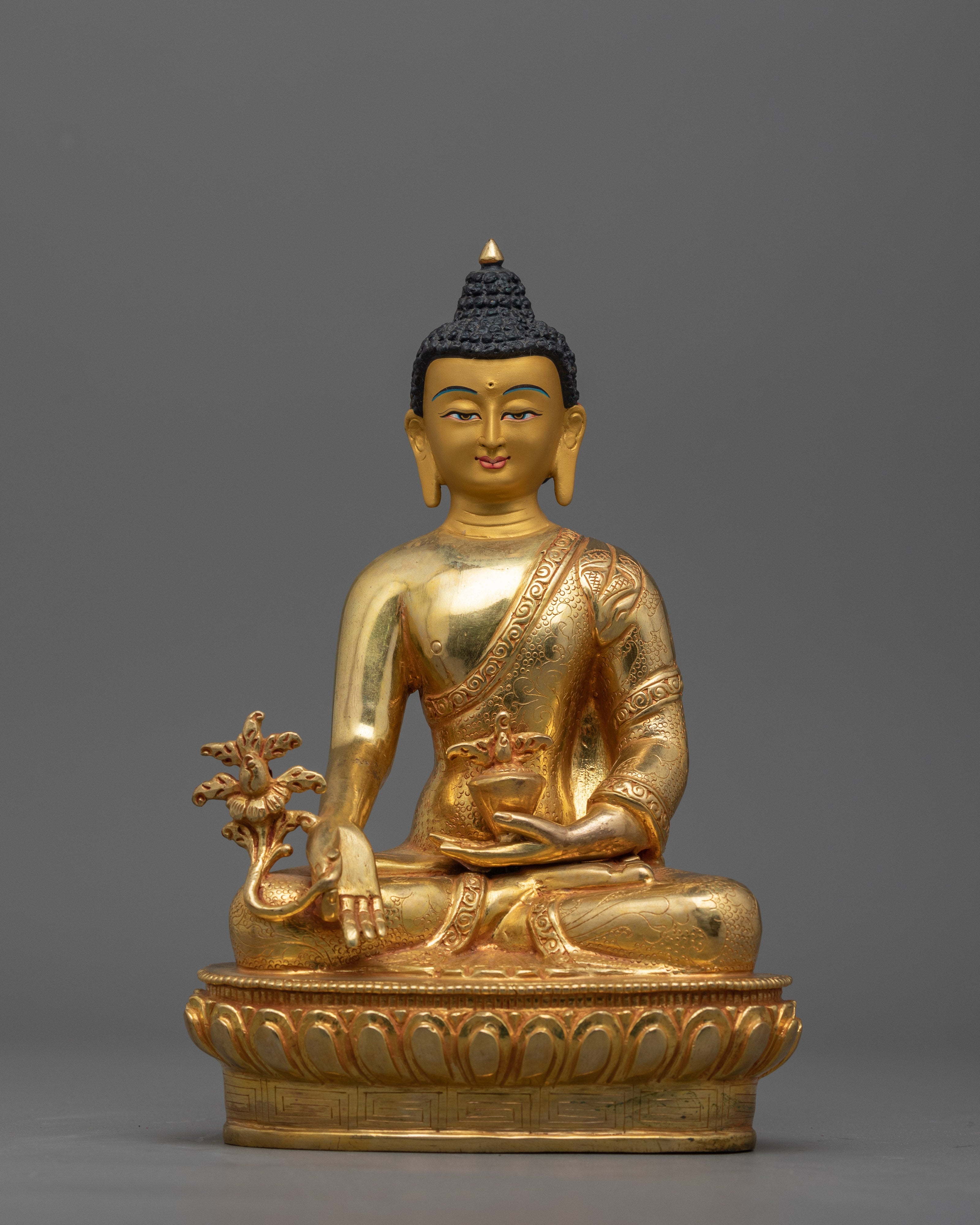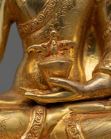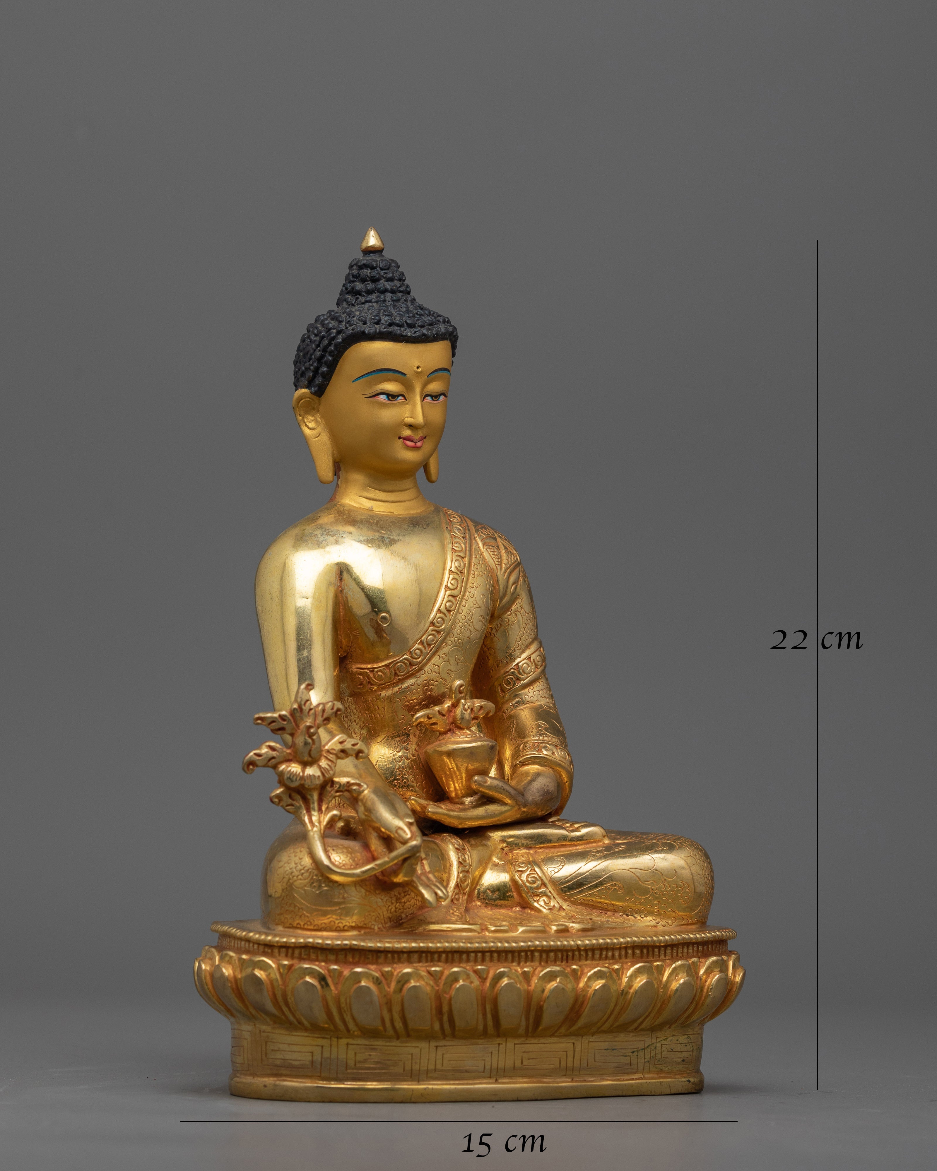 The Tibetan Bhaisajyaguru Sculpture (Medicine Buddha), stands at 8.7 inches (22 cm) in height with a base width of 5.9 inches (15 cm). Crafted from a solid copper body, this statue is adorned with 24K gold gilding, enhanced by intricate gold and acrylic paintings. Representing Bhaisajyaguru, the Buddha of Healing, this statue portrays the Medicine Buddha in a meditative posture, holding a medicine bowl in his left hand and a myrobalan plant in his right hand, symbolizing his role as a healer of both physical and spiritual ailments. Perfect for sacred spaces, the Medicine Buddha statue serves as an inspiring reminder of hope, recovery, and the elimination of suffering.
