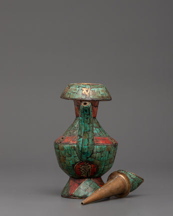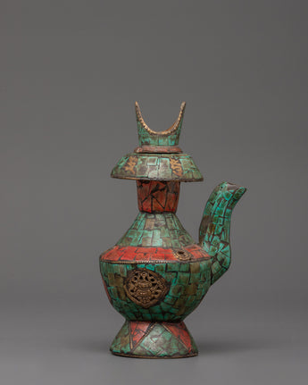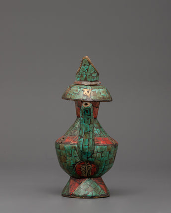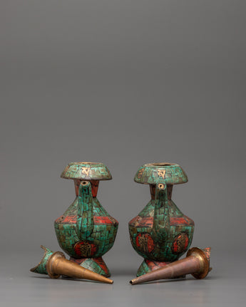 Tibetan Bhumba Set with Turquoise & Coral Inlay | Copper Ritual Water Vases