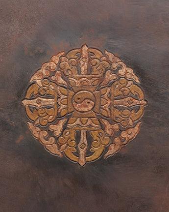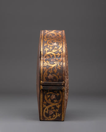 Made by talented Tibetan artisans, this Ghau Box showcases their craftsmanship. They start by forging the core from iron for strength and durability. The surface is then carefully covered with brass, which is shaped and engraved with intricate patterns. These symbols are more than decorative—they embody sacred motifs linked to protection, prosperity, and enlightenment in Tibetan tradition. Silver inlays are precisely added to enhance the design, with each piece carefully etched to integrate seamlessly with the brass, making this box a distinctive and precious item.