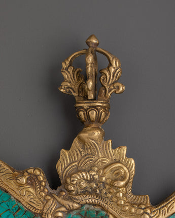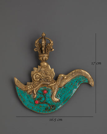 Discover the Tibetan Brass Kartika Knife, a sacred ceremonial dagger meticulously crafted to serve as both a spiritual instrument and a stunning ornamental piece. This knife is made of brass and embellished with bright artificial stone inlays of coral and turquoise. It measures 17cm in height and 16.5cm in breadth and weighs 0.36kg, making it ideal for use in meditation or ceremonial rites. Its intricate craftsmanship and symbolic design make it an excellent addition to any collection of Himalayan decor or Buddhist ceremonial instruments. This tantric dagger is not only a beautiful piece for spiritual practitioners, but also a potent symbol of protection and cleansing.