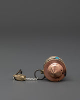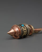 This Tibetan Brass Prayer Wheel, measuring 7.5 cm in height and 2 cm in breadth, weighing about 0.010 kg, is made of a copper or brass body decorated with artificial turquoise stones. These prayer wheels are spiritual tools used in Tibetan Buddhism to acquire wisdom and merit, as well as to purify negativities by spinning the wheel, which is frequently inscribed with the mantra "Om Mani Padme Hum" and filled with mantras inside.