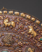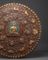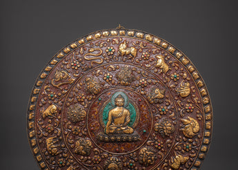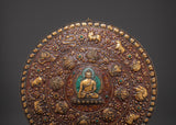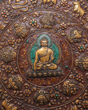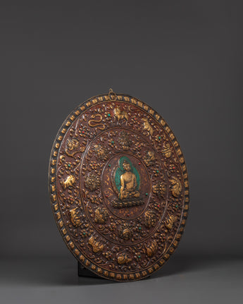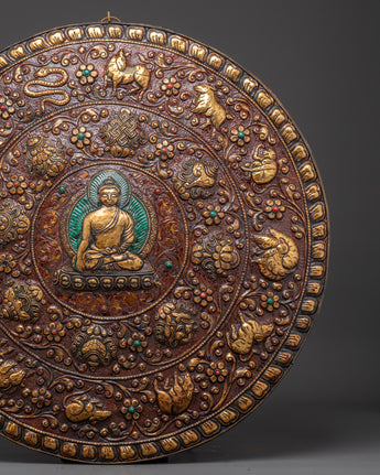 Bring sacred presence and powerful symbolism into your space with this Handmade Tibetan Buddha Wall Hanging, a stunning depiction of Shakyamuni Buddha, At the heart of this handcrafted brass plaque is Shakyamuni, the historical Buddha, seated in calm meditation, radiating wisdom, serenity, and the enlightened path. Around him, intricately detailed animals, including a monkey, a goat, a bird, a snake, and other species, reflect the interconnectedness of all life in Buddhist philosophy.