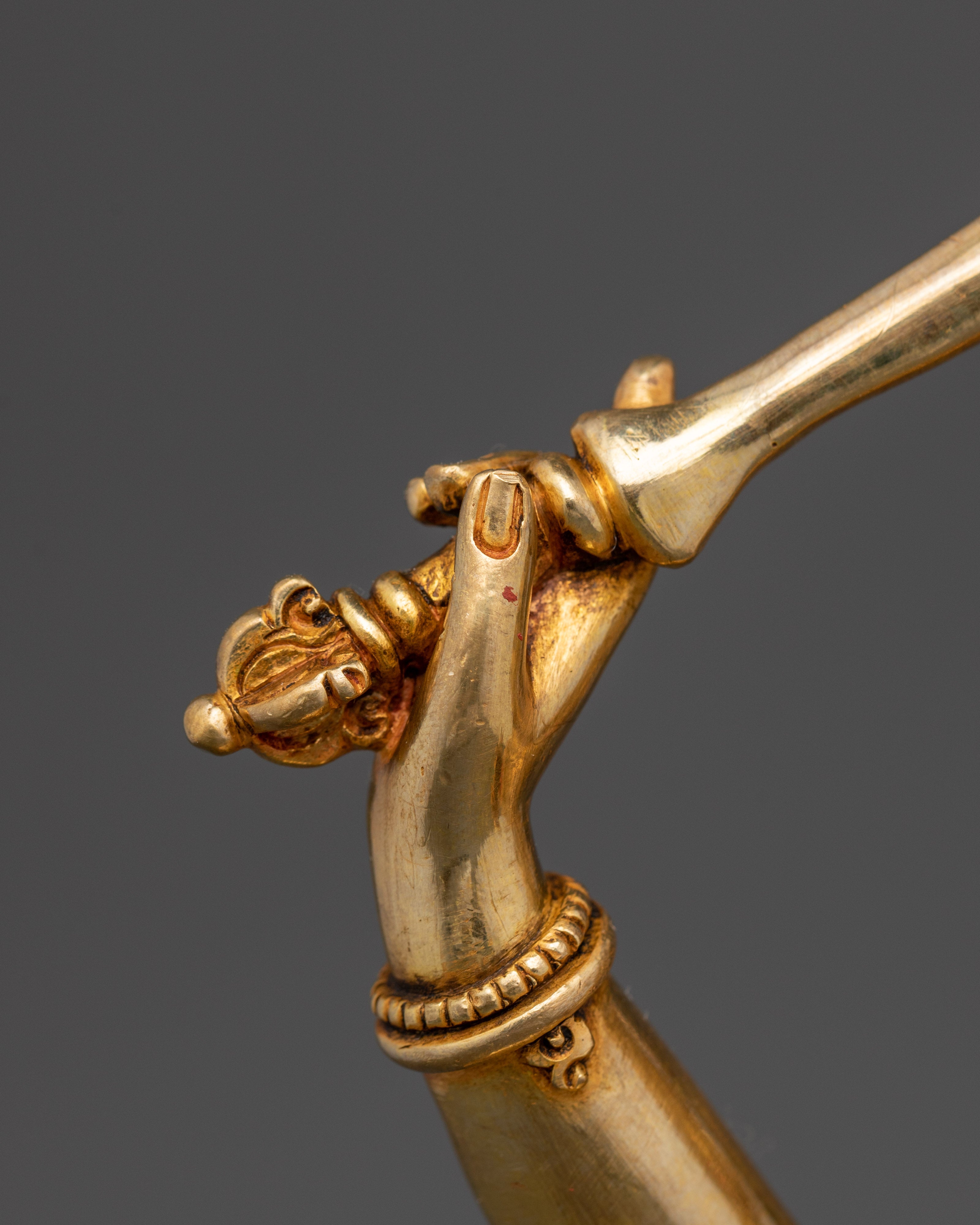 Tibetan Buddhism Manjushri is expertly fashioned from 24K gold gilded materials. Standing 9.1 inches tall, this intriguing sculpture represents the expertise of experienced artisans from Patan, a historic city noted for its superb metal craftsmanship. The statue's copper body is wonderfully embellished with gold and acrylic paintings, highlighting delicate details that add to its spiritual presence.