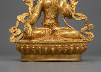 The White Tara Goddess Statue is a serene representation of compassion and longevity, created with dedication in the heart of Tibetan Buddhism. This statue is made up of a copper body gilded in 24K gold and measures 9"/23cm in height and 6.9"/17.5cm at the base, weighing 1.65 kilograms. This sculpture is an addition to any Buddhist altar or meditation place, providing protection, healing, and blessings.