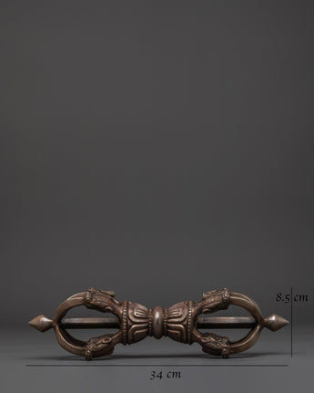 Enhance your spiritual journey with this Tibetan Buddhist Altar Object Vajra, a revered symbol of indestructibility, clarity, and unwavering spiritual strength. Crafted meticulously from iron, this ritual tool measures 32.5cm wide and 18.5cm tall, weighing 5.13 kg, offering a substantial and grounding presence in any sacred space. The Vajra, or Dorje, holds deep significance in Tantric Buddhist ceremonies, embodying the unbreakable nature of truth and enlightenment. Ideal for serious practitioners, this powerful object not only enriches your rituals but also serves as a lasting reminder of inner resilience and spiritual clarity.