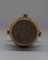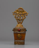 Admired for their meaning in Buddhist teachings, these fortunate symbols are commonly used in ceremonies and displayed to call for protection, wealth, and spiritual harmony. This set is a wonderful complement to any religious setting or collection of Tibetan art because the amber stamp adds a distinctive and exquisite finish, and the gold and silver shine on the white metal highlights the delicate design. This set reflects both spiritual regard and great craftsmanship, making it an inspiring presence in any setting, whether it is used for meditation or as a decorative object.
