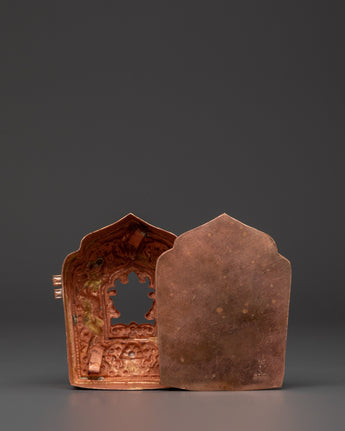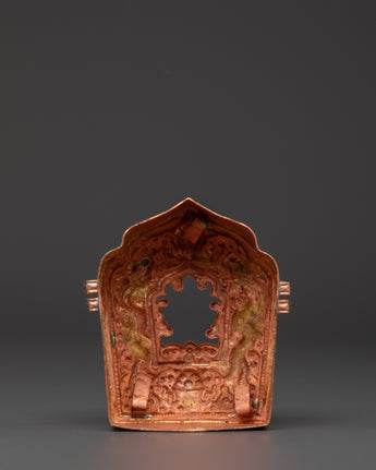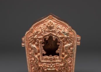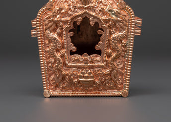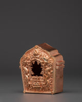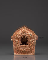 This box, skillfully crafted from a copper body and completed with gold plating, radiates ritual elegance and dedicated craftsmanship. It measures 8.5cm tall and 8cm broad, making it excellent for use on home altars, while traveling, or as part of your spiritual jewelry collection. Weighing 0.10 kg, this item combines functionality with deep spiritual meaning. This Ghau box is ideal for people seeking beauty, safety, and a connection to the Tibetan Buddhist heritage.