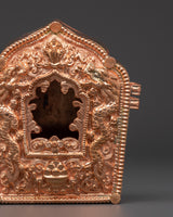 This Tibetan Buddhist Copper Ghau Box is a gorgeous handcrafted amulet shrine that may hold sacred relics, mantras, or miniature god statues. This portable prayer box, featuring a windowed front surrounded by intricate carvings of flowers and dragons, is used in Himalayan cultures for personal devotion and spiritual protection. The core term "Tibetan Buddhist Copper Ghau Box" is related to cultural heritage and spiritual value, making it a desirable item among practitioners and collectors alike.