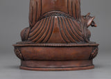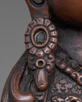 The Guru Rinpoche statue depicts Padmasambhava, also known as Guru Rinpoche, who is regarded as the founder of Tibetan Buddhism and a teacher of spiritual teachings. This statue, handcrafted with precise detail and featuring an oxidized copper body, demonstrates the remarkable skill of Tibetan skilled artisans. The statue stands 9.3"/23.5cm tall and has a base of 5.7"/14.5cm. It weighs 1.36 kg and is an ideal centerpiece for any altar or sacred space.