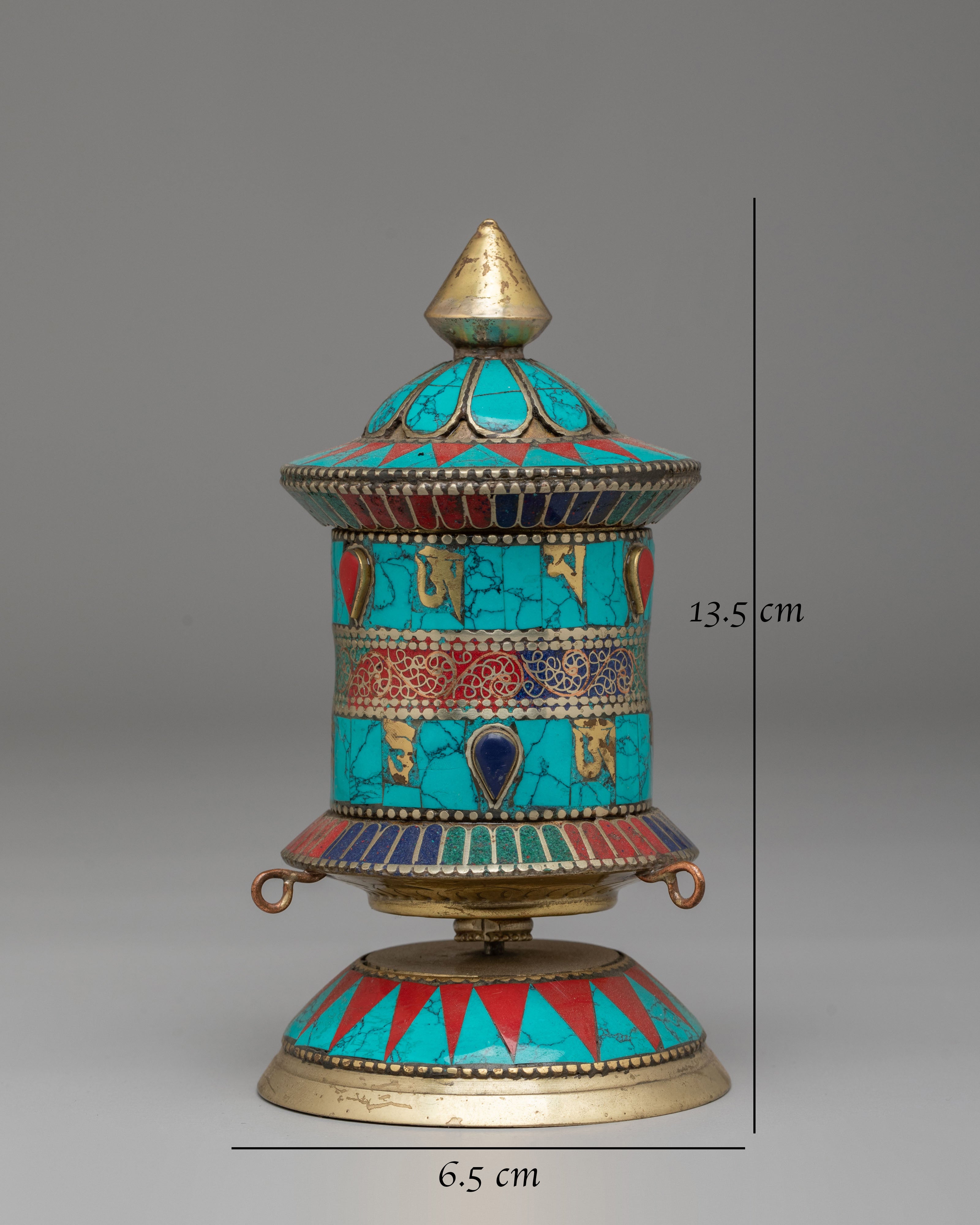 This Traditional Tibetan Mantra Wheel measures 14 cm in height and 6.5 cm in width, with a weight of 0.15 kg. It features a copper body finished with acrylic colors. The compact structure makes it comfortable to hold and easy to place on a personal altar, meditation table, or prayer space. Its balanced design allows it to remain stable when set on a flat surface, making it suitable for both use and display.