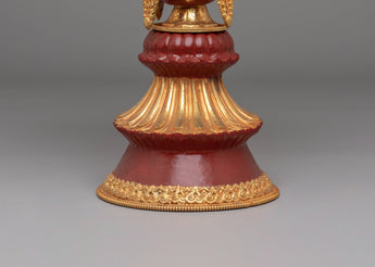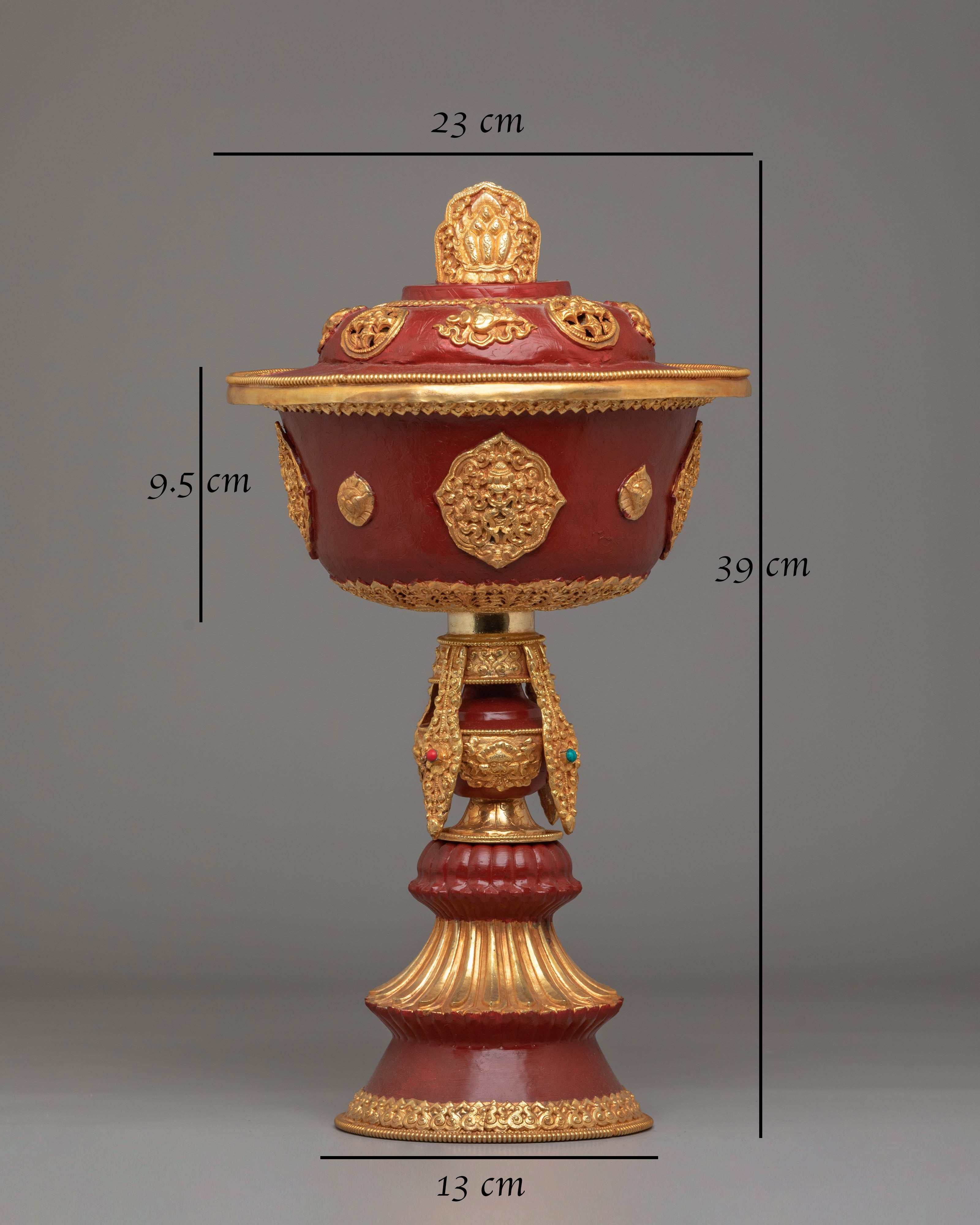 This Tibetan Butter Lamp for Offering is a stunning piece of spiritual art, handcrafted with meticulous care and attention to detail. Standing at 39 cm tall and with a 23 cm diameter, this lamp is designed to offer light and positivity during Buddhist rituals, ceremonies, and meditation practices. Made from a copper body with electro-gold plating, it combines traditional Tibetan craftsmanship with symbolic spiritual motifs. The gemstone accents add an extra layer of beauty and meaning, making this lamp a unique addition to your altar or sacred space.