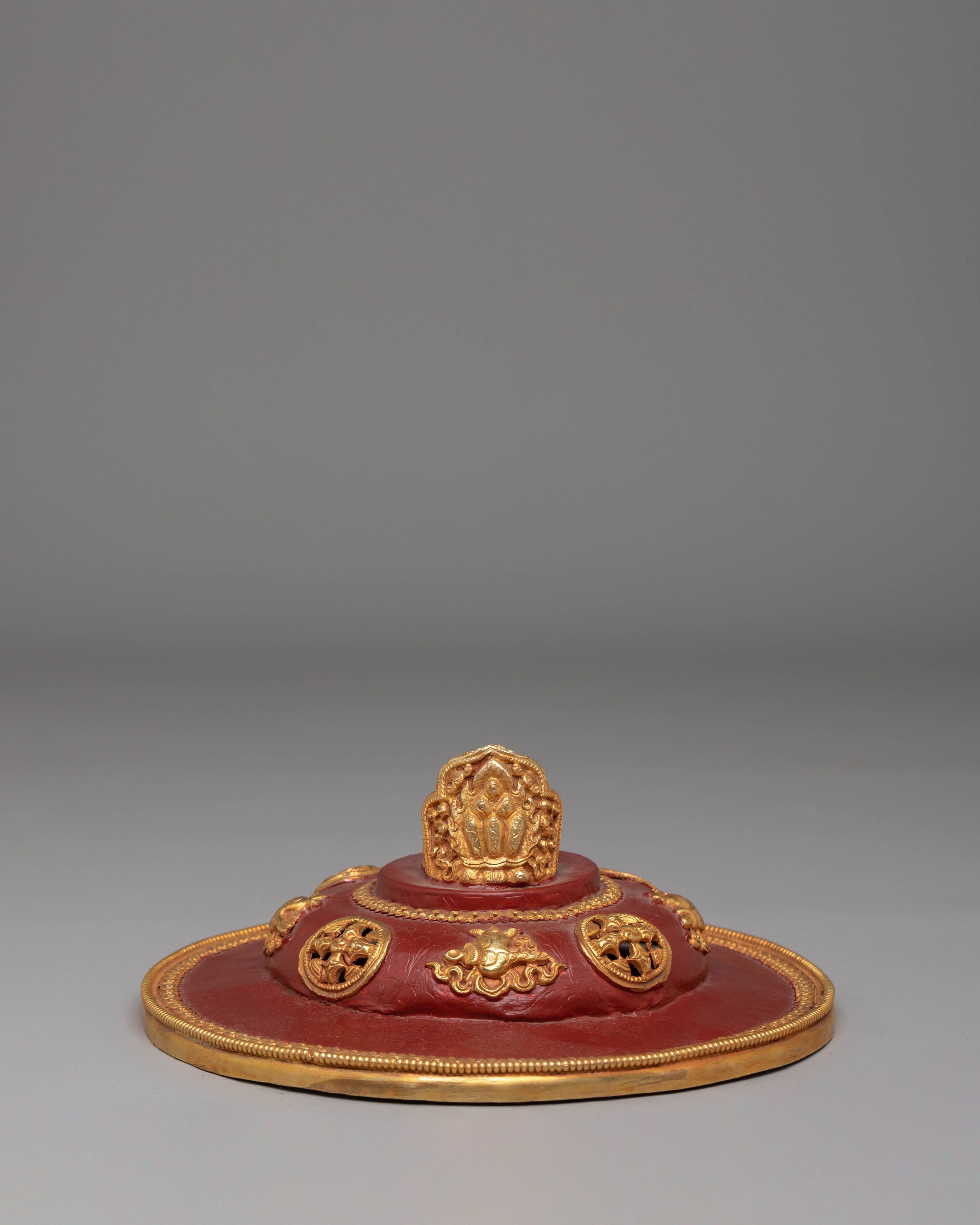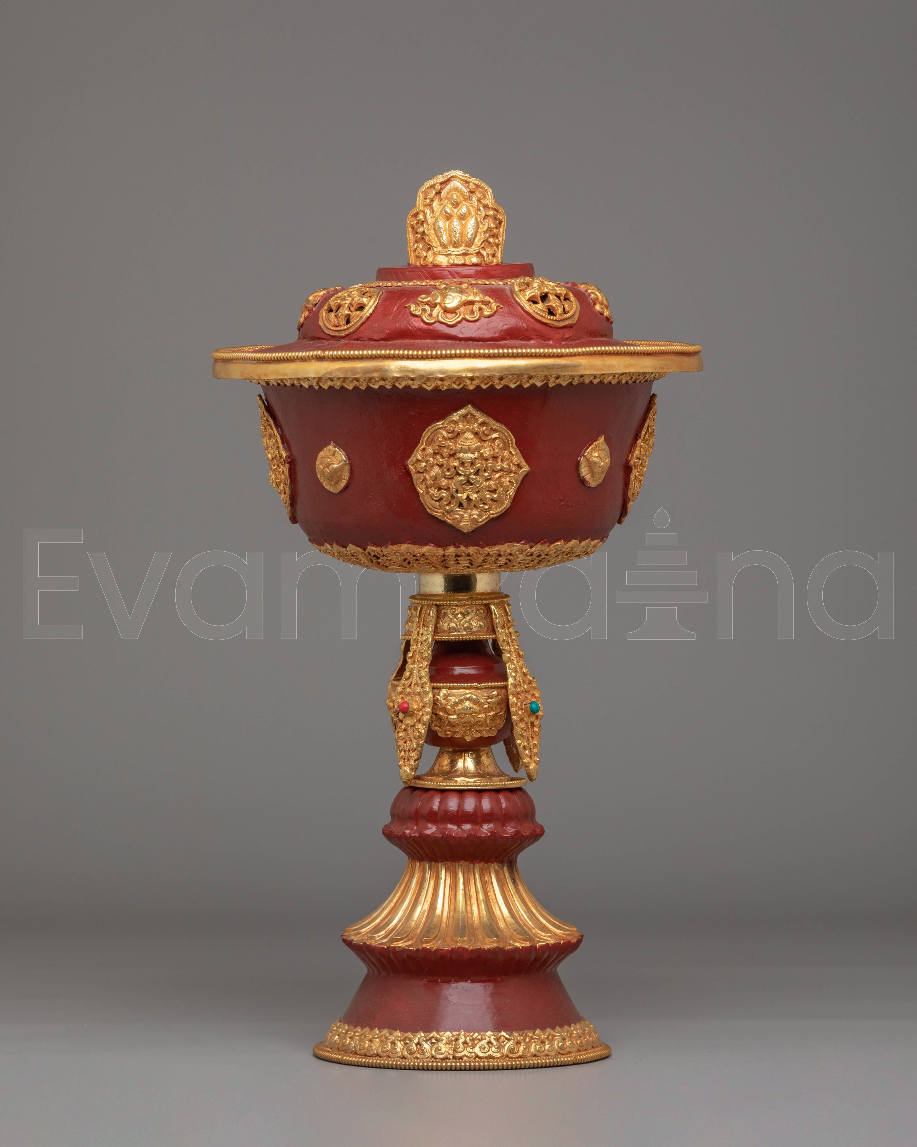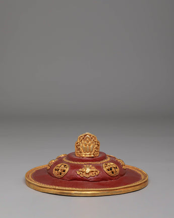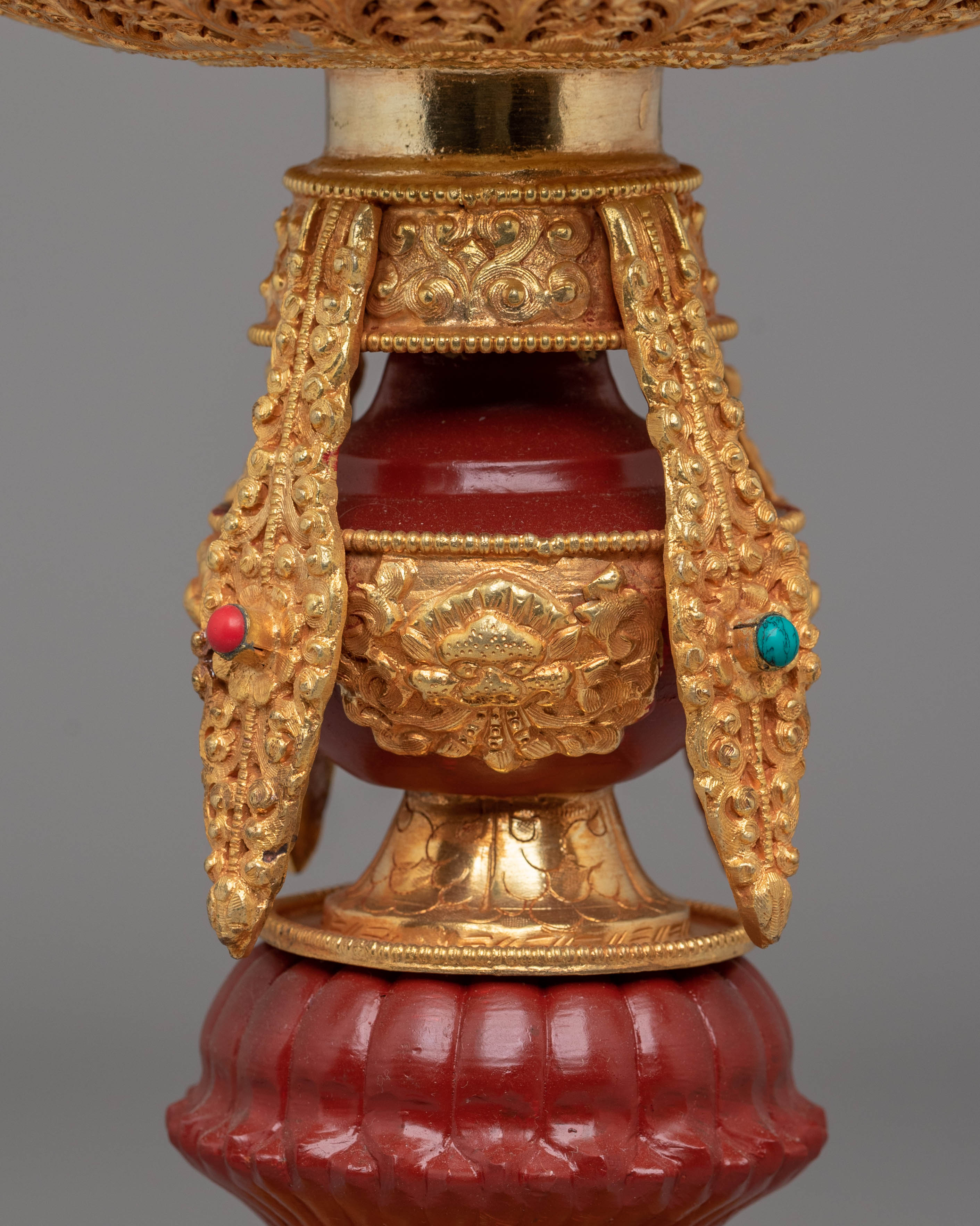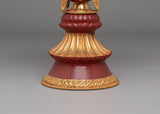 The Tibetan butter lamp is a sacred offering in Buddhist practice, symbolizing the dispelling of ignorance and the illumination of the path to enlightenment. The gold plating reflects purity and wisdom, while the gemstones incorporated into the design bring added healing and protection. The inner depth of 9.5 cm allows an adequate amount of butter to be placed for burning, making it both functional and spiritual. The intricate acrylic color and delicate motifs enhance its decorative qualities, making it a cherished centerpiece in any spiritual setting.