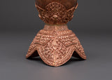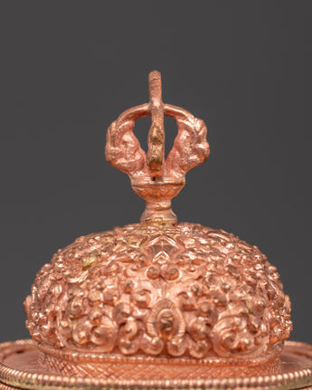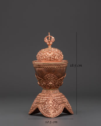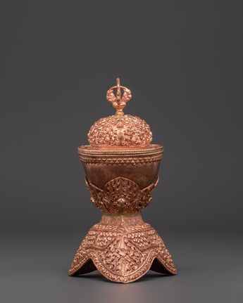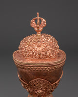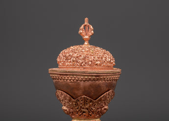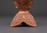 This Tibetan Copper Kapala Skull Cup is a precious ritual relic used during Tantric Buddhist rites. This Kapala measures 18.5 cm in height and 10.5 cm in breadth, featuring an intricately crafted lid topped with a vajra finial and a stunning copper base. Weighing 0.53 kg, it is used as a ritual cup for symbolic sacrifices to wrathful deities and dakinis, assisting practitioners in discarding their ego and awakening enlightened awareness.