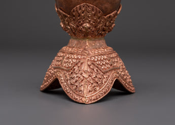 The skull cup is handcrafted from copper and adorned with traditional patterns and floral motifs that have been carefully engraved into its surface to enhance both its ceremonial and aesthetic appeal. The Kapala, revered in Himalayan Vajrayana traditions, serves as both a spiritual instrument and a meaningful display item on any altar. Its presence inspires contemplation, dedication, and the transformational power of holy practice.