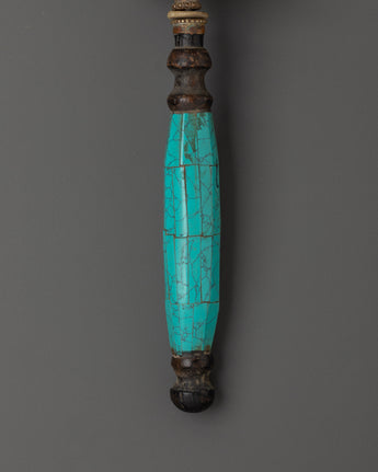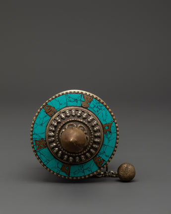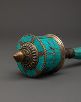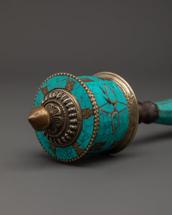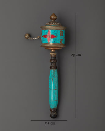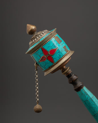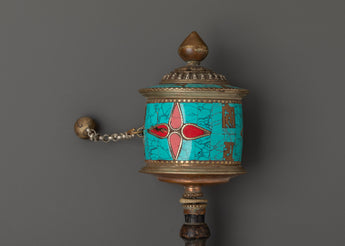 This prayer wheel, meticulously carved, exemplifies precise artisanship with ancient roots in the Himalayan tradition. The use of coral and turquoise inlay adds to its visual and energetic appeal, making it a treasured piece for daily rituals, meditation, or as a thoughtful gift. Whether employed as a Buddhist prayer wheel, a spiritual meditation spinner, or a Tibetan mantra instrument, it serves as a link between internal reflection and external serenity. This handheld coral prayer wheel is excellent for holy areas, promoting attention and spiritual alignment.