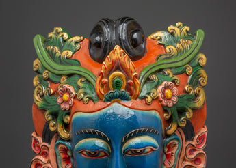 This Tibetan Deity Wall Hanging, a masterfully carved and hand-painted mask depicting divine compassion and mindfulness, will add tranquility and spiritual elegance to your room. This wooden sculpture, 46cm tall and 31cm broad, depicts a tranquil, blue-faced deity embellished with vibrant, flower- and flame-like patterns symbolizing holy light. This sacred mask, crafted using ancient Himalayan techniques and adorned with brilliant acrylic colors, embodies harmony and cultural richness.