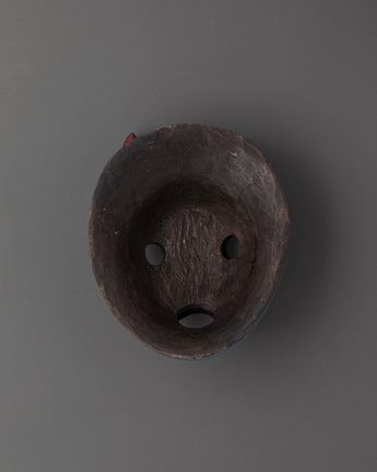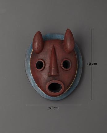 This Tibetan Demon Wall Mask, delicately handcarved from wood and painted in outstanding acrylics, captures the violent force of Himalayan ritual art. This mask, which measures 19cm tall and 16cm broad, is intended to have both spiritual importance and a strong visual impression. Its striking features and traditional design inspire a sense of protection and sacred meaning that are deeply rooted in Tibetan culture.