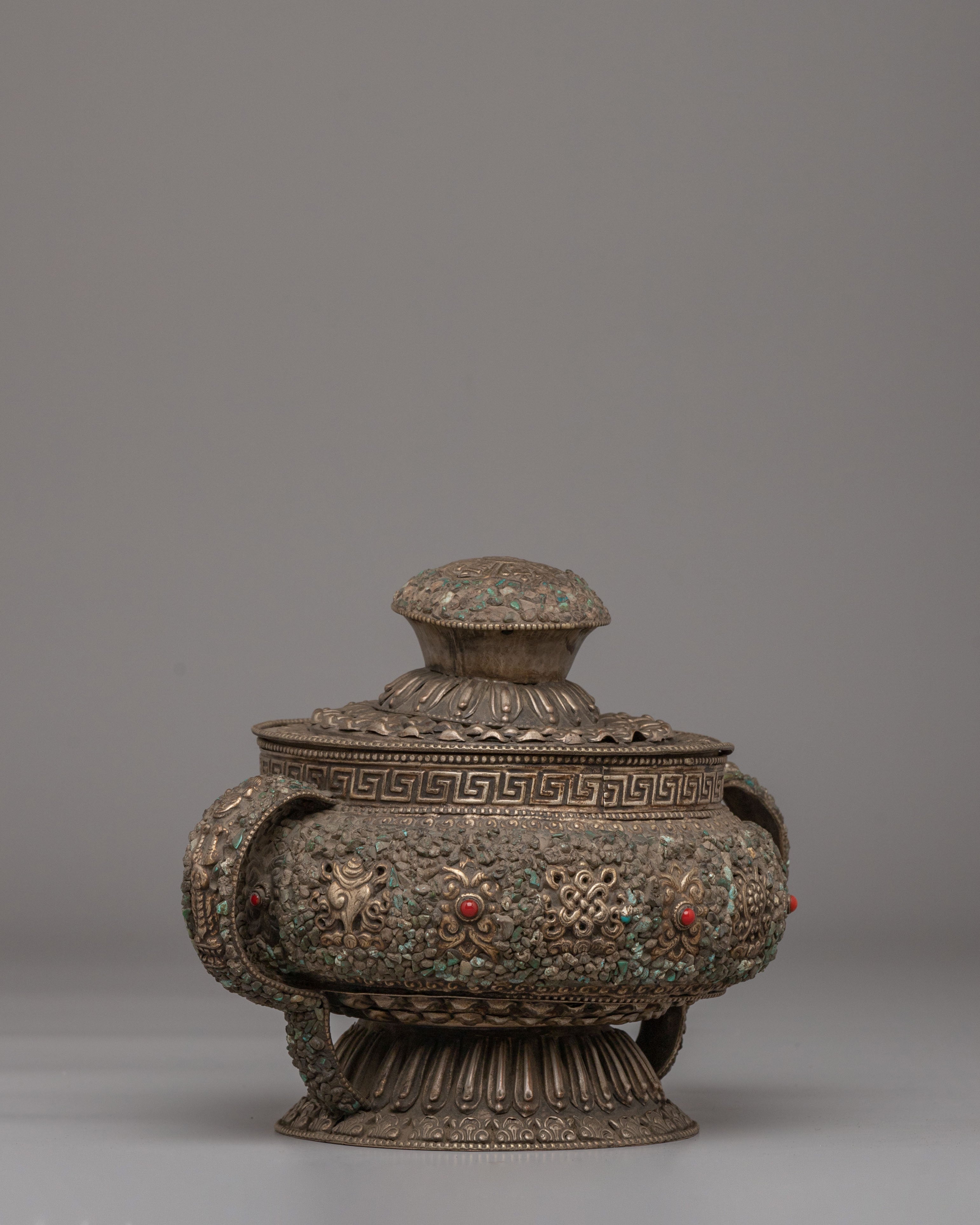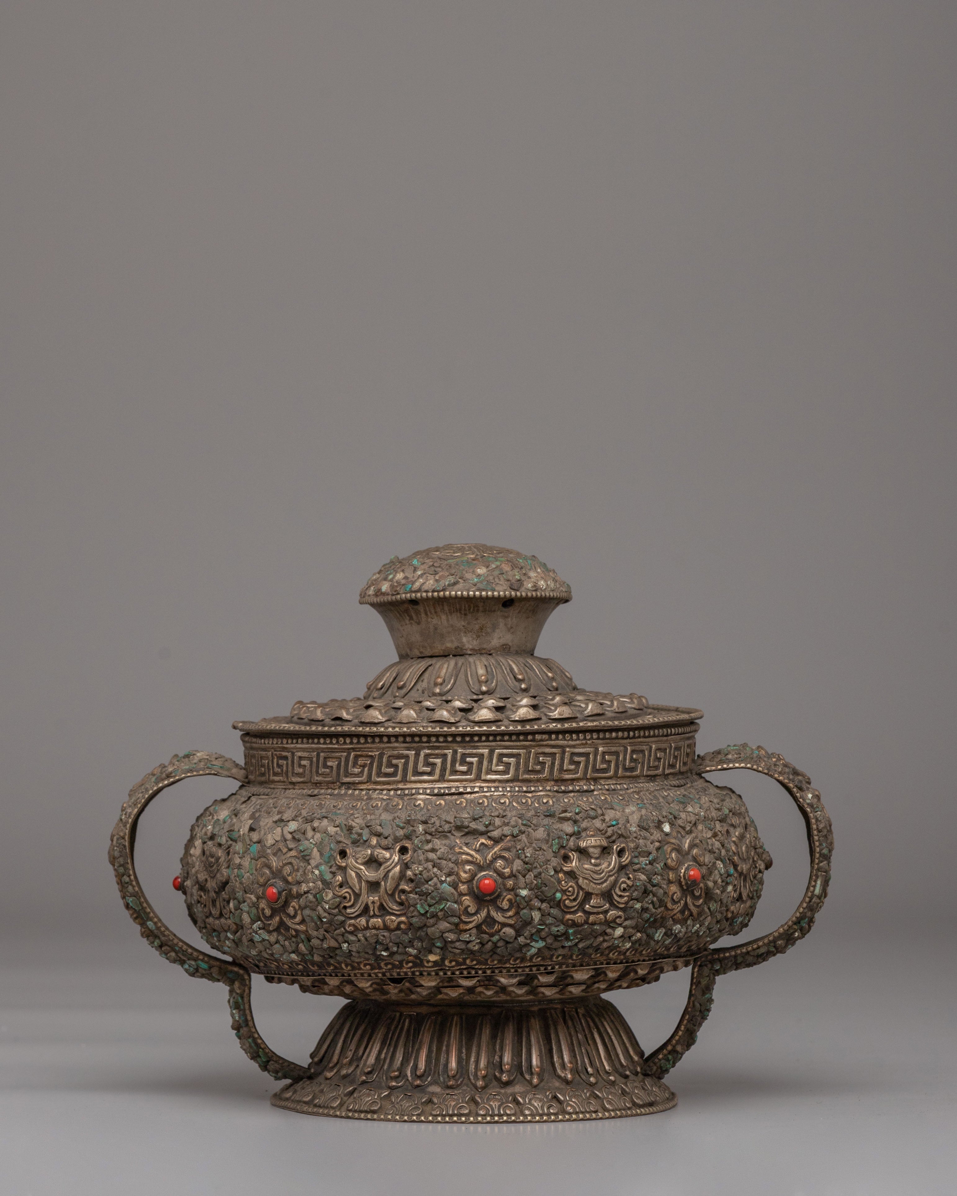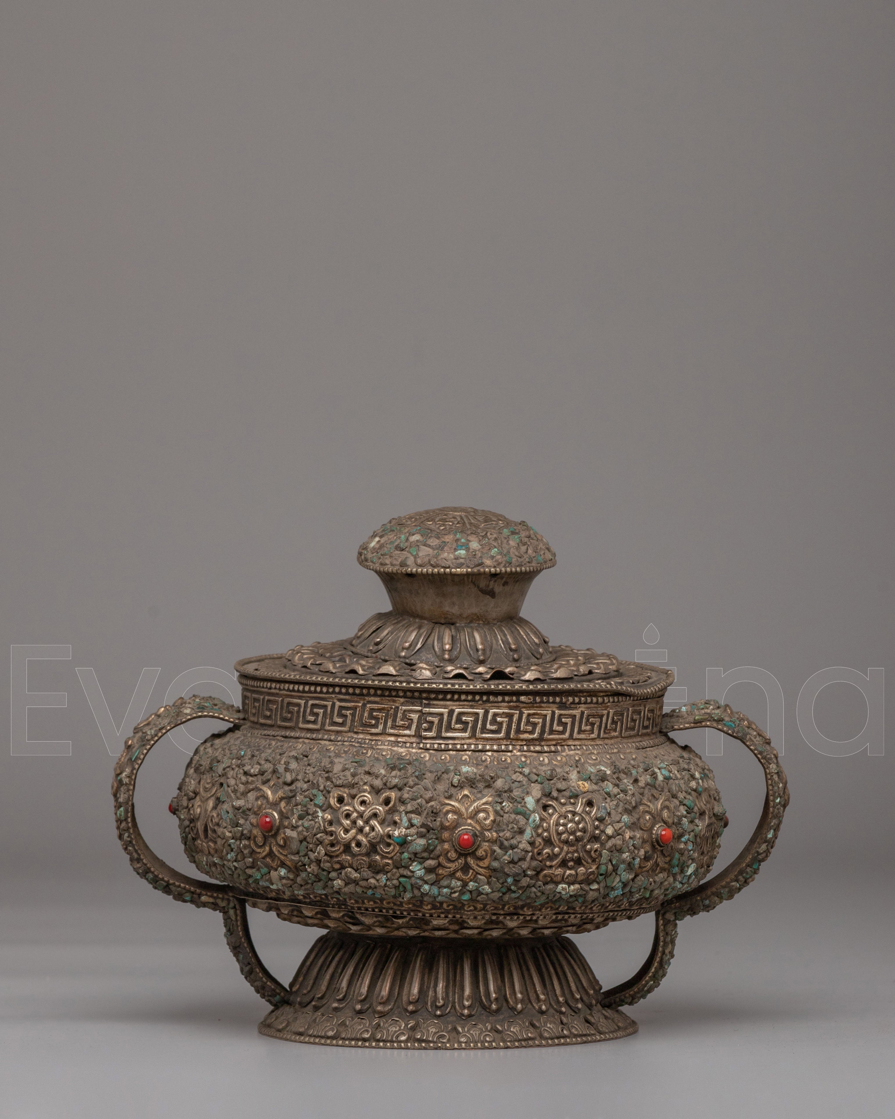 Ideal for Buddhist altar décor, ritual offerings, and collectors of Himalayan spiritual art, this Tibetan Dhupur Rice Pot embodies devotion and sacred symbolism. As a Buddhist offering bowl with Astamangala motifs and gemstone inlay, it serves as a powerful representation of abundance and merit-making practice. This Tibetan ritual vessel, Buddhist altar offering pot, and sacred shrine décor piece beautifully reflects traditional craftsmanship and spiritual heritage.