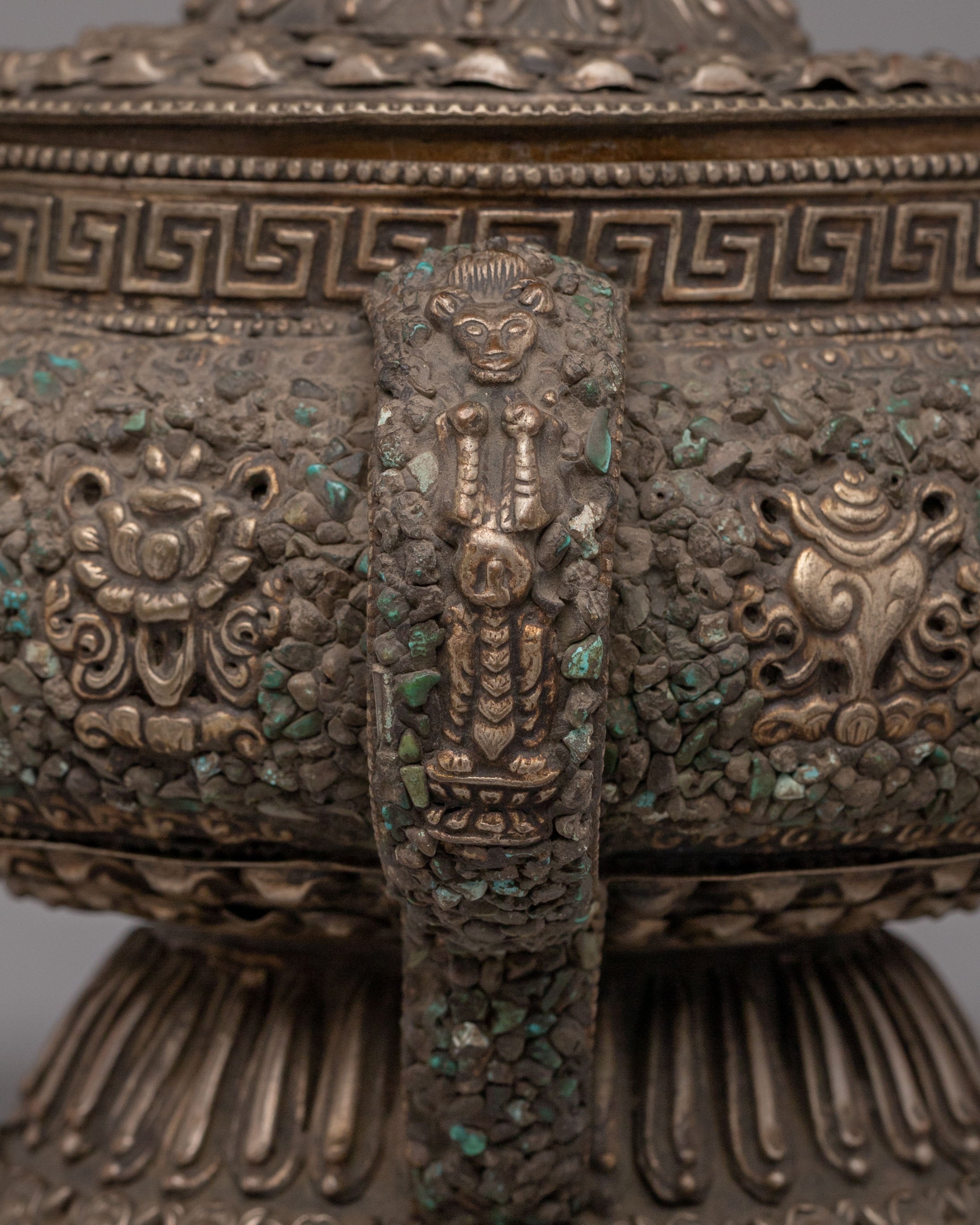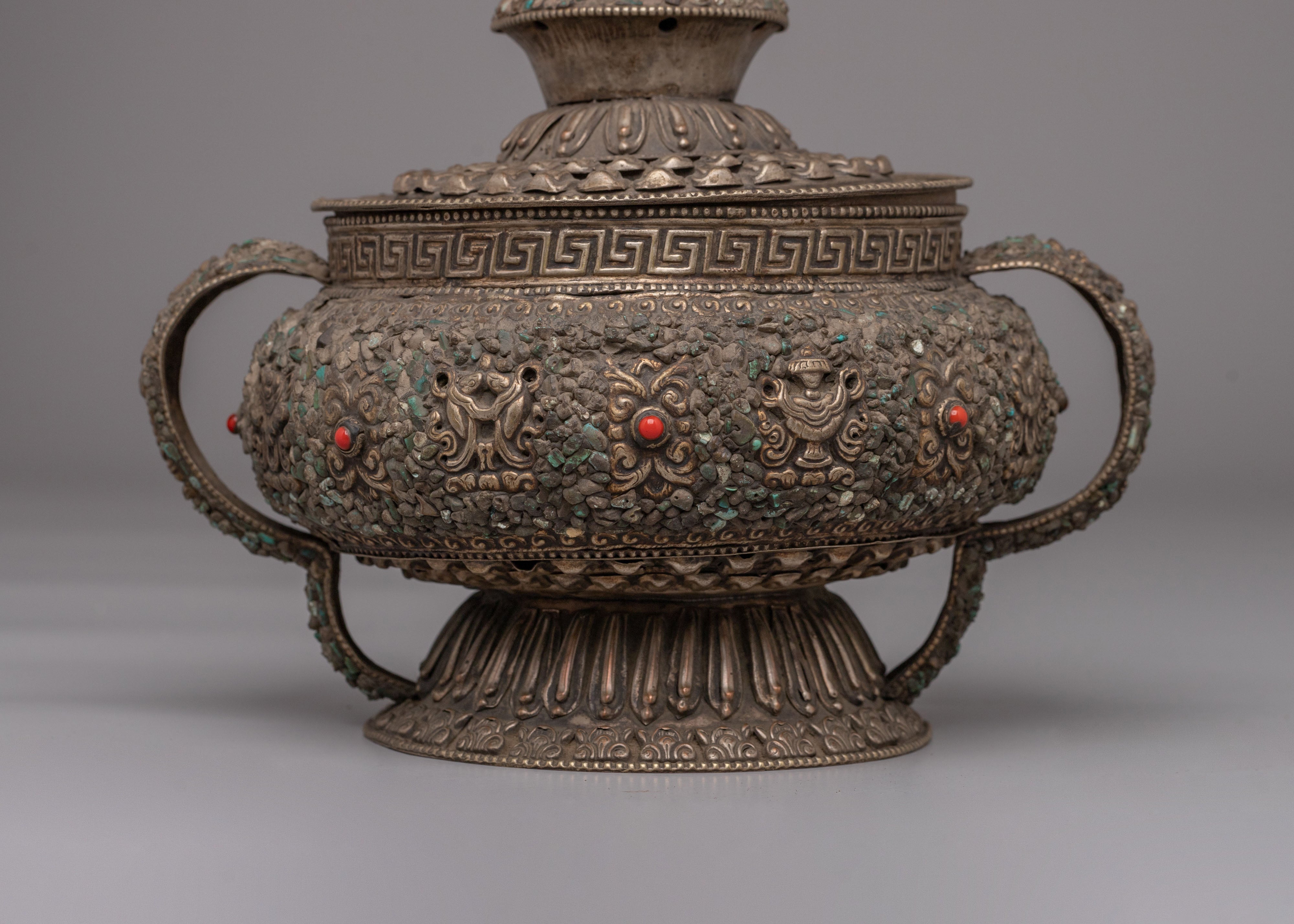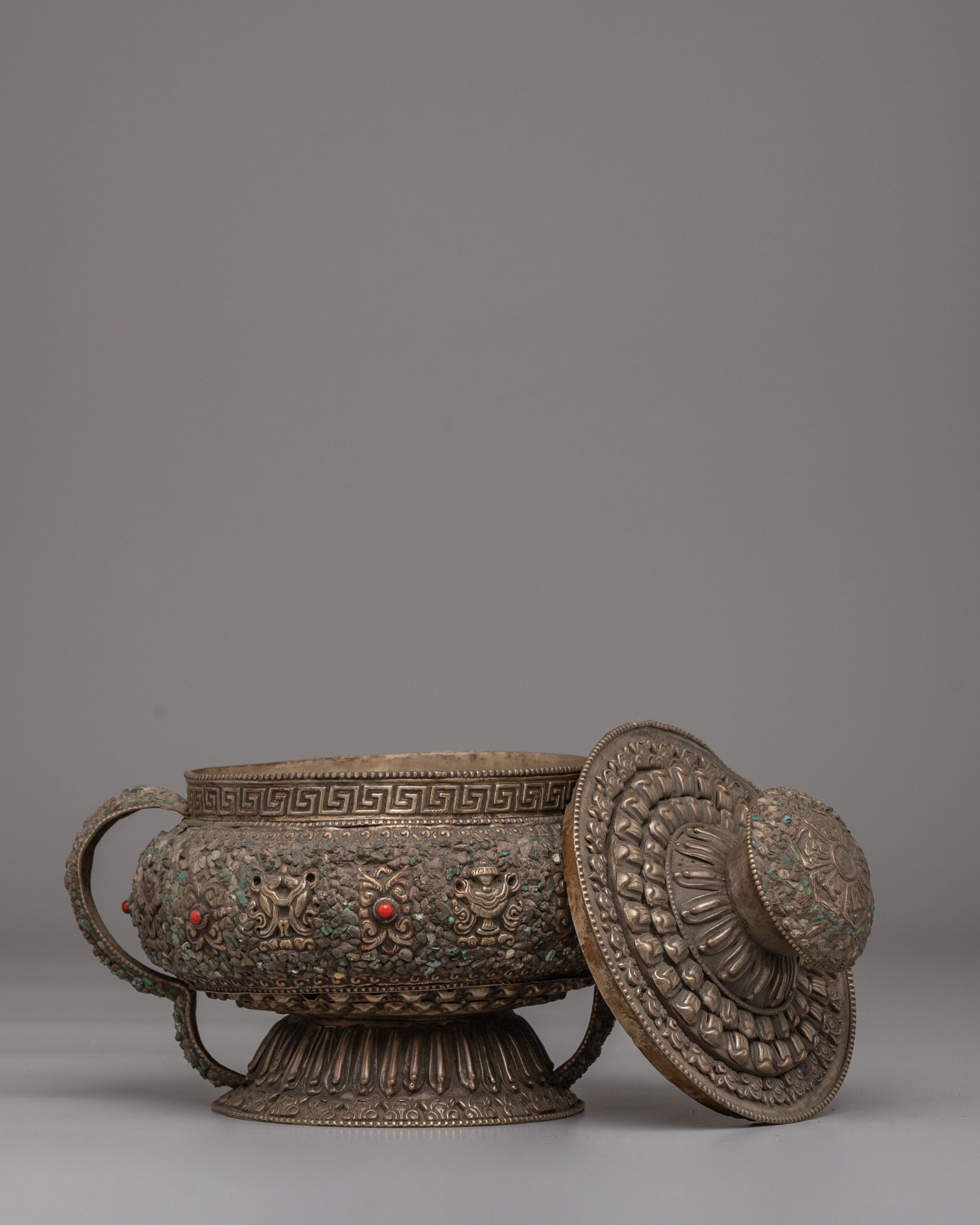Ideal for Buddhist altar décor, ritual offerings, and collectors of Himalayan spiritual art, this Tibetan Dhupur Rice Pot embodies devotion and sacred symbolism. As a Buddhist offering bowl with Astamangala motifs and gemstone inlay, it serves as a powerful representation of abundance and merit-making practice. This Tibetan ritual vessel, Buddhist altar offering pot, and sacred shrine décor piece beautifully reflects traditional craftsmanship and spiritual heritage.