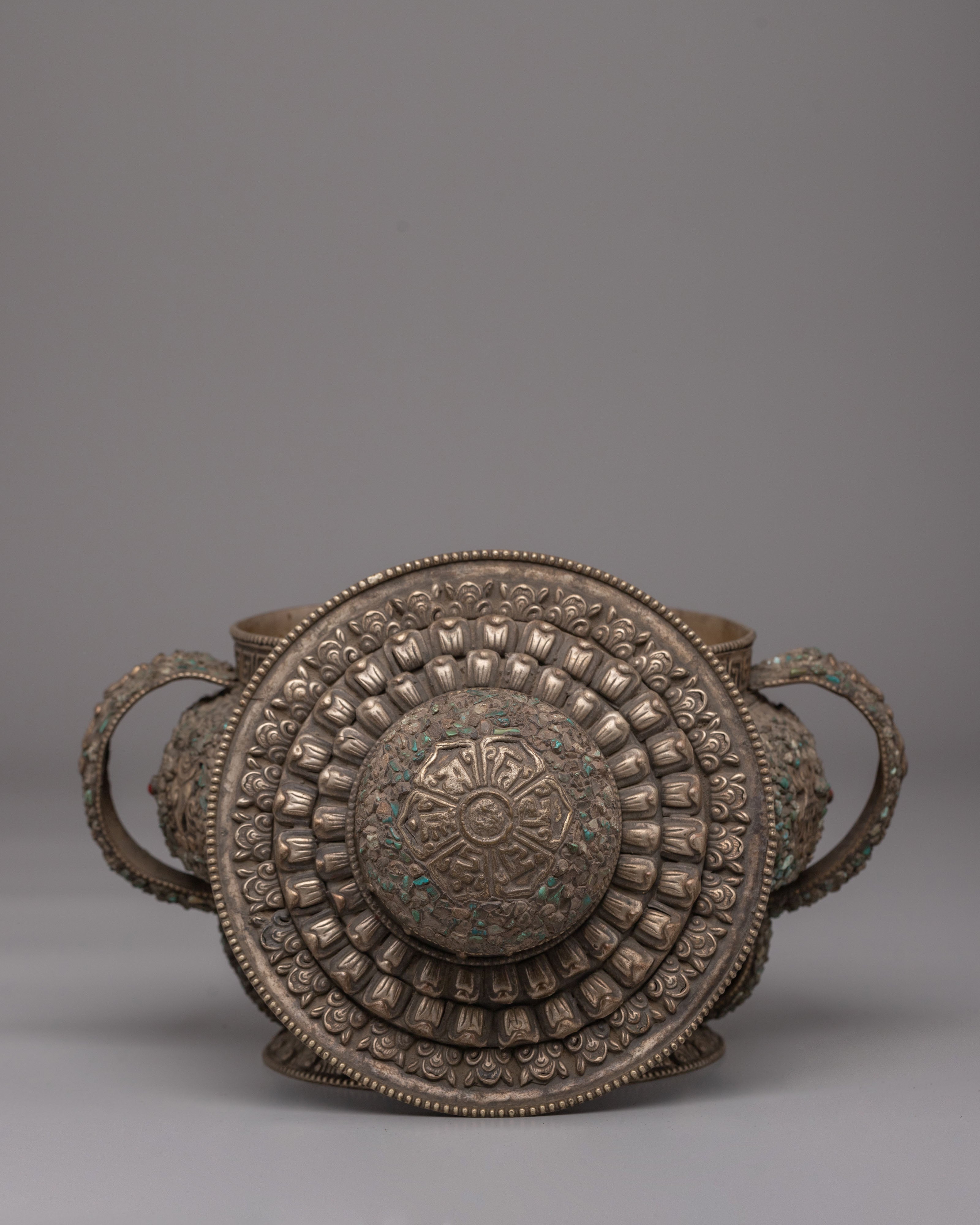 The surface of this offering vessel is richly decorated with detailed carvings and embedded stones that create a textured, layered appearance. Surrounding the body are the revered Astamangala, the Eight Auspicious Symbols of Buddhism, representing prosperity, protection, harmony, wisdom, and spiritual awakening. The handles are equally ornate, featuring raised sculptural motifs that add symbolic depth to the design. The careful placement of colorful gemstone accents enhances the sacred character of the vessel while highlighting the traditional craftsmanship behind its design.