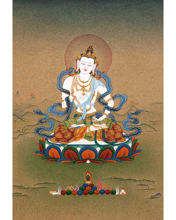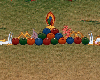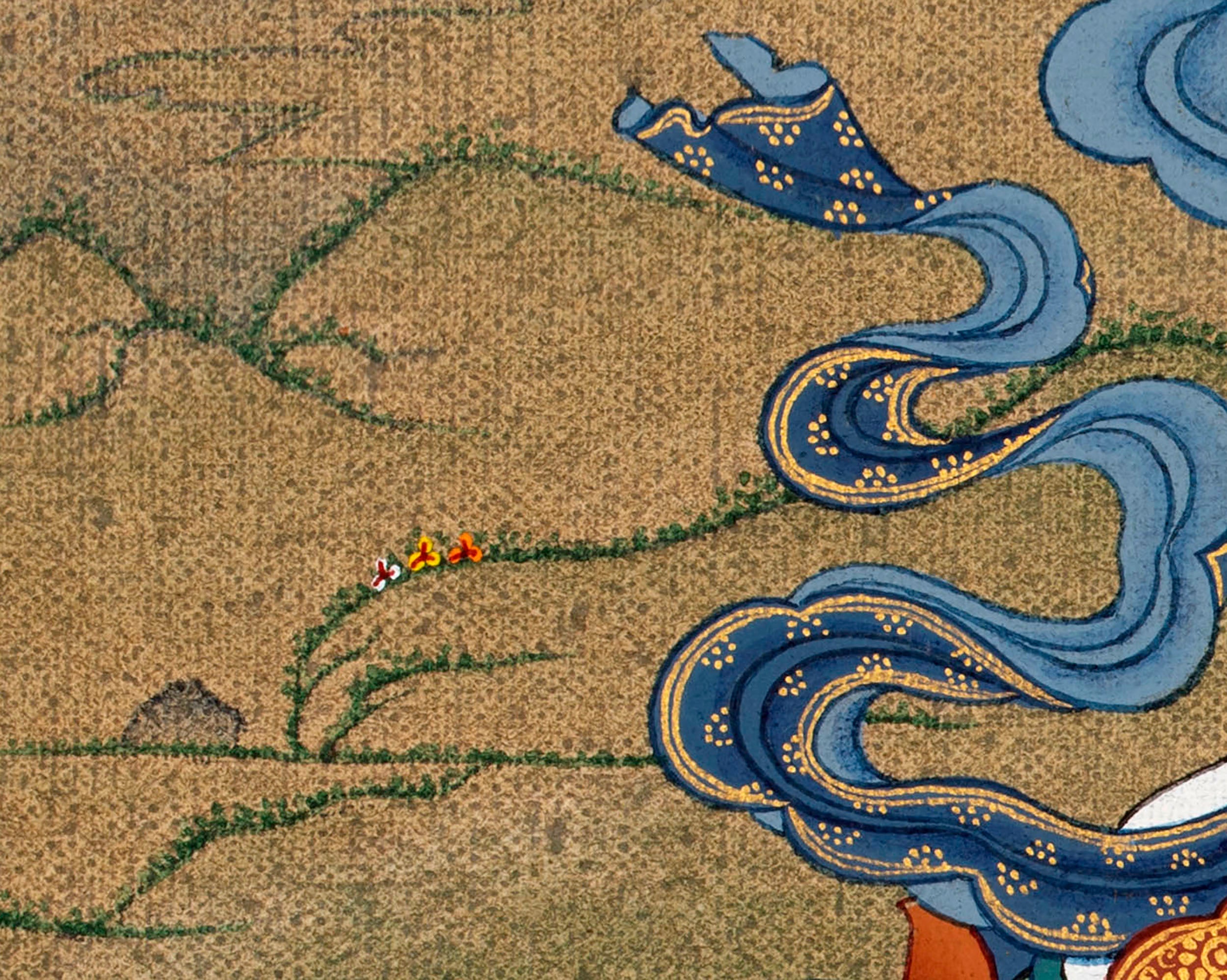 In this thangka, Dorje Sempa is depicted as a single figure holding the vajra in his right hand and the bell in his left, muted against his thigh. Our artist has painted this thangka with 24K gold and acrylic color in a traditional karma gadri style. He sits calmly on a moon disc atop a lotus seat, his legs crossed, signifying that he endured this impure cycle of rebirth for sentient beings. The flowing robes, the light crimson halo that illuminates his face, and the offerings in this thangka are extraordinarily captivating and provide positive energy.