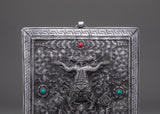 With this Tibetan Dragon Wall Hanging, a captivating iron plaque that exudes strength and cultural significance, you can unleash ancient power and protective energy in your sacred space. This wall hanging features a meticulously carved dragon, a symbol of power, protection, and transformation in Himalayan Buddhism, that serves as a fierce protector against negativity. The dragon's dynamic expression, bold lines, and intricate details add a vibrant presence to meditation spaces, altars, and living areas.