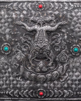 This wall hanging, handcrafted from durable iron and adorned with vibrant artificial coral and turquoise stones, showcases the traditional artistry of Himalayan metalwork. The repoussé technique lends the dragon a three-dimensional, lifelike appearance that is both ancient and vibrant. Coral represents life force and passion, while turquoise represents healing and spiritual clarity, making this piece not only a visual focal point but also a tool for energetic balance and spiritual protection.