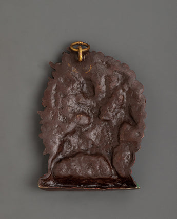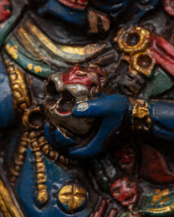 This handcrafted Tibetan fierce deity wall hanging, 16cm tall and 12cm wide, is a powerful Vajrayana Buddhist protection mask intended to ward off negativity and preserve sacred regions. This wrathful god mask is made from copper and painted with elaborate acrylic details, representing the transformational energy of wisdom and spiritual strength. In Tibetan Buddhism, powerful deities act as compassionate protectors, eliminating ignorance, impediments, and harmful energies through their imposing appearance.