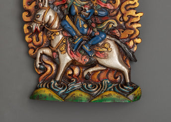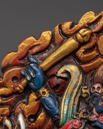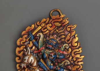 This Buddhist guardian mask is perfect for altar decorations, meditation spaces, or spiritual household adornment. It weighs 0.590 kg and is strong and small, making it ideal for wall display or ceremonial usage. The deity's powerful expressiveness and symbolic features indicate its role in guiding practitioners to enlightenment while also providing spiritual defense. Whether for contemplative purposes, house defense, or for Buddhist art collectors, this powerful god wall hanging is an essential and stunning artwork.