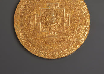 This Tibetan Ganesha Mandala Wall Hanging is a spiritually profound and beautifully appealing brass artwork that displays Lord Ganesha at the center of a sacred mandala. Ganesha, the remover of obstacles and the god of knowledge and fresh beginnings, is depicted in a powerful central position surrounded by a beautiful mandala of lotus petals, traditional yantra, and intricate floral carvings. This artwork, measuring 39cm high by 38cm broad and weighs 1.24kg, would make an excellent focal point for any home temple, altar, or meditation area.