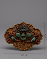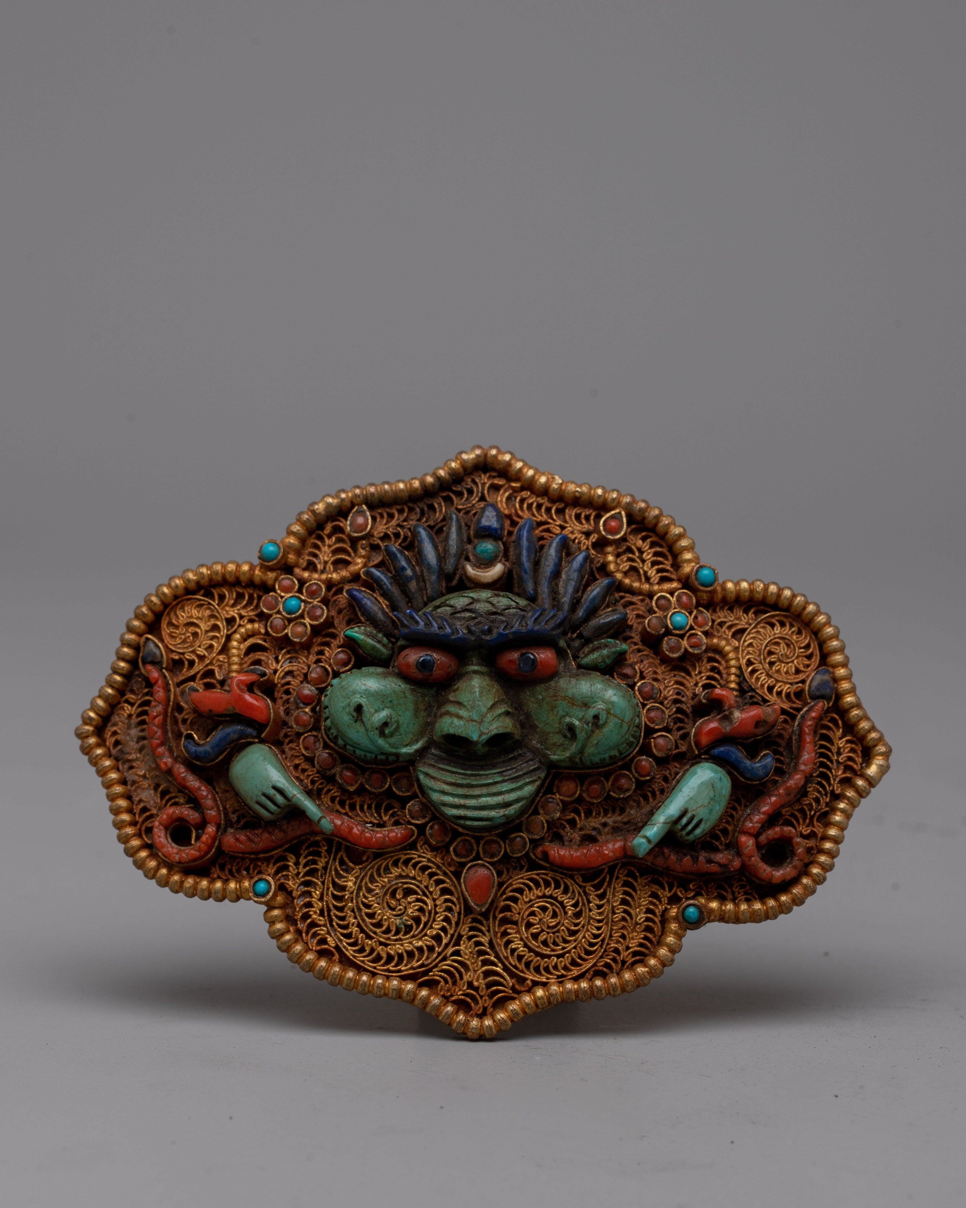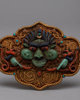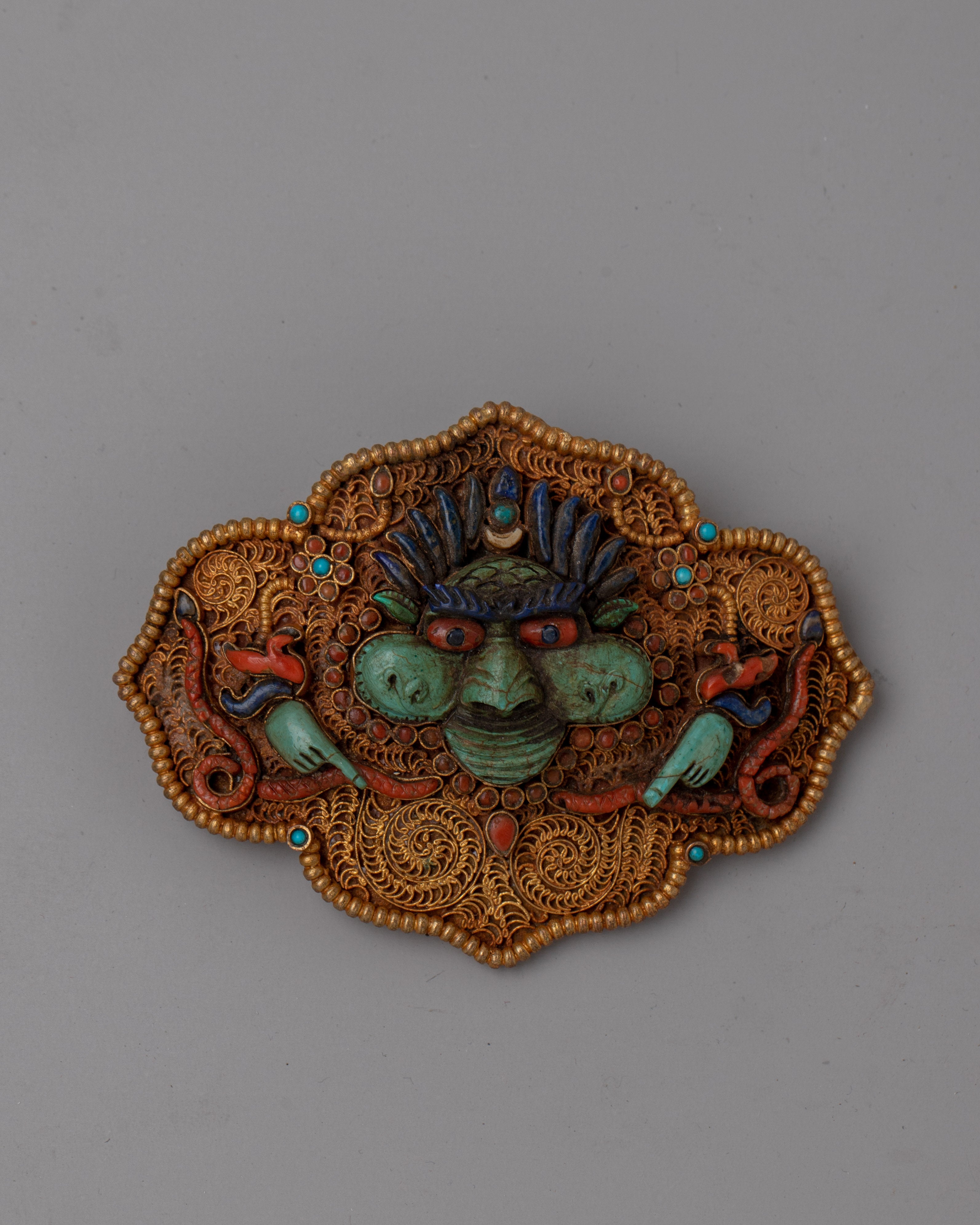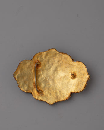 The Tibetan Garuda Belt is a handcrafted masterpiece with a robust copper body and exquisite electro gold plating. This traditional belt has a design with turquoise, coral, and lapis lazuli stones painstakingly inlaid into the workmanship. Each stone is picked not just for its beautiful value, but also for its profound symbolic importance in Tibetan culture.