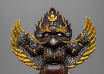 This Tibetan Garuda Wall Decor is expertly created from oxidized copper and accentuated with electro gold and silver plating for a polished, majestic finish. This item, measuring 37 cm in height and 30 cm in width, weighs 0.77 kg and demonstrates excellent craftsmanship. The combination of copper's endurance and the elegance of gold and silver makes it a stunning accent to any religious or ornamental place.