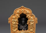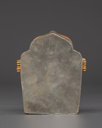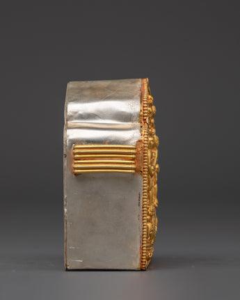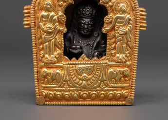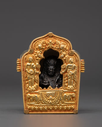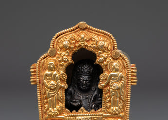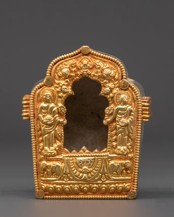 The Ghau box, crafted from copper and gilded with 24K gold, showcases intricate embossing with two standing figures on either side of the shrine window. It is 9.5 cm high and 8.5 cm wide, with an included oxidized copper deity statue standing 7 cm tall. The contrast between the luminous gold and the dark oxidized figure creates a powerful spiritual presence that enhances any altar or practice area.