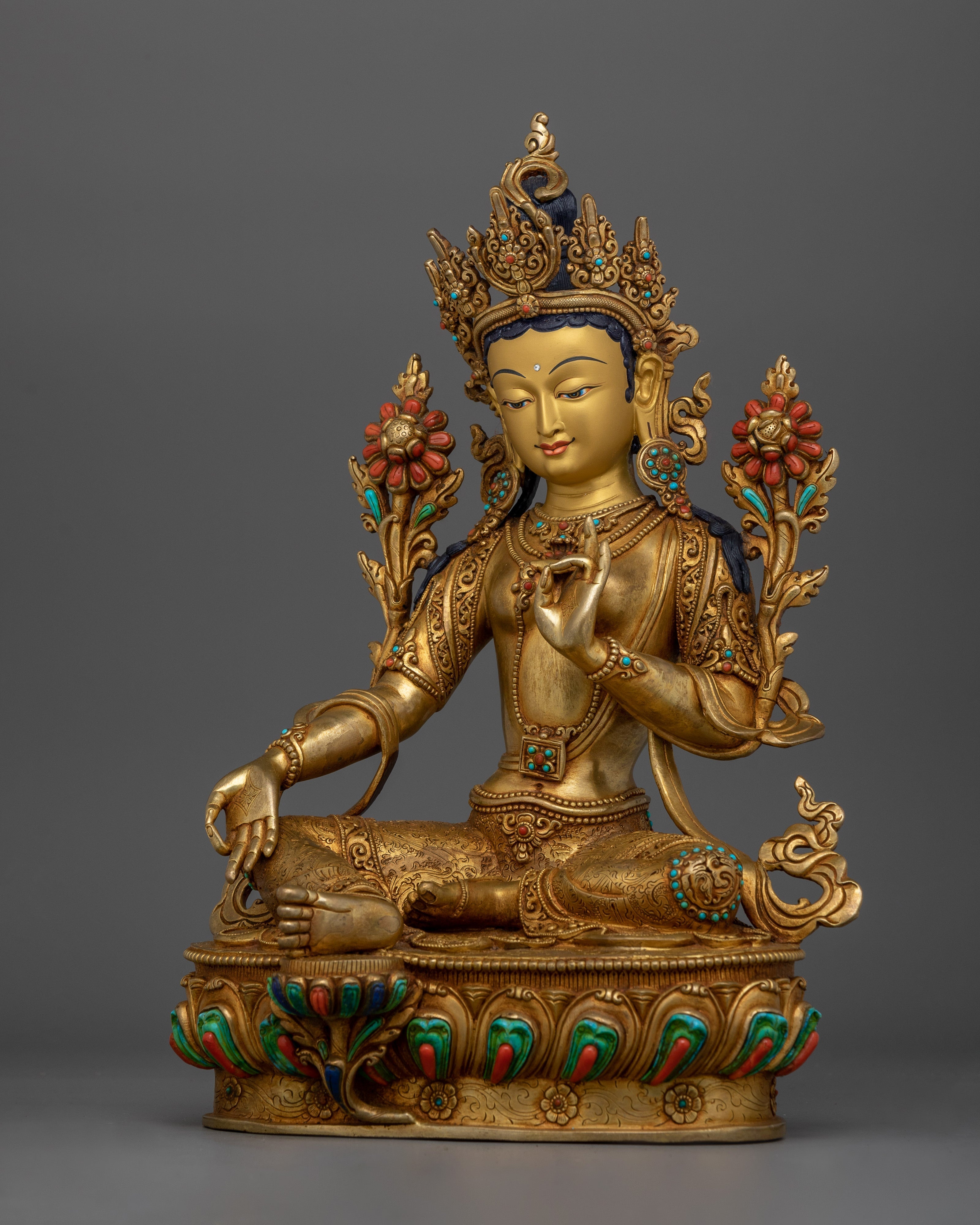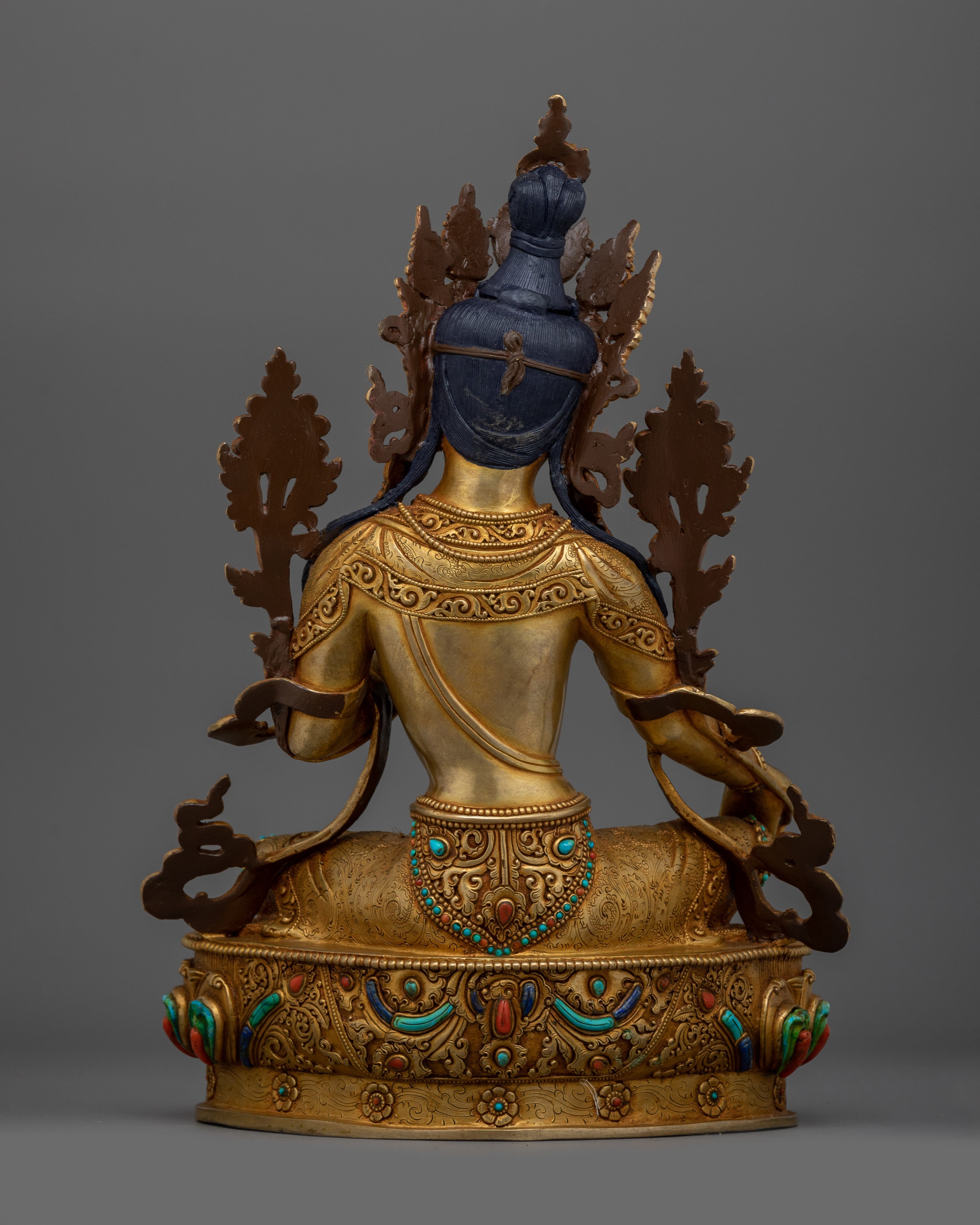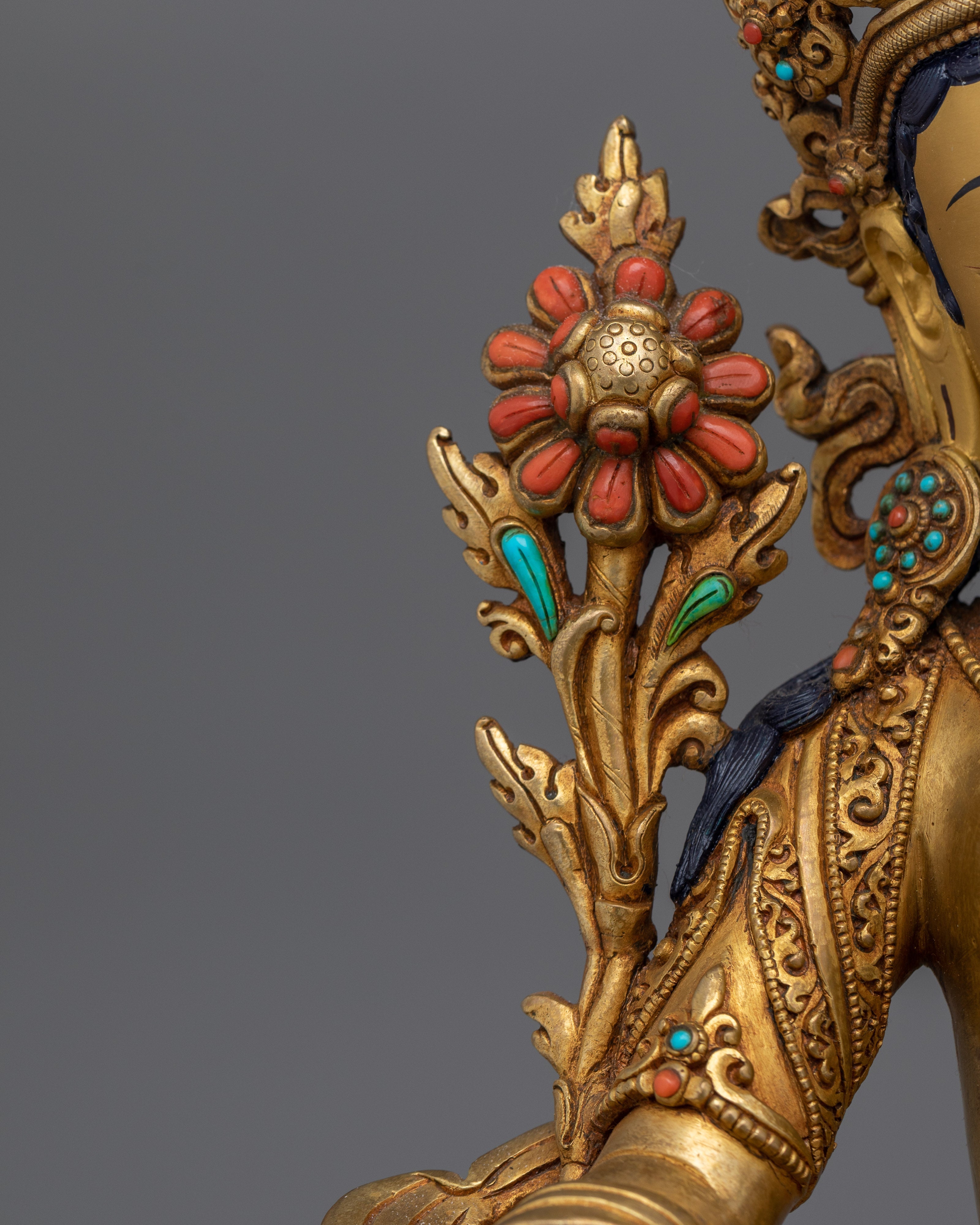 Green Tara is displayed in this representation resting in the classic lalitasana pose, signifying her willingness to take action in the world for the good of all living beings. Her left hand is lifted in the protection mudra, offering safety from harm and fear, while her right hand is extended in the giving mudra, signifying her generosity and eagerness to bestow blessings. A blue lotus blossom (utpala), symbolizing purity and divine regeneration, blooms in each of her palms to symbolize the transcending of sorrow. Her expression conveys a sense of calm while also highlighting her desire to act quickly to assist those in need. With its representation of Green Tara's infinite compassion and vigorous energy, this statue is ideal as a focus point for devotion and meditation.