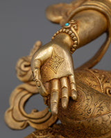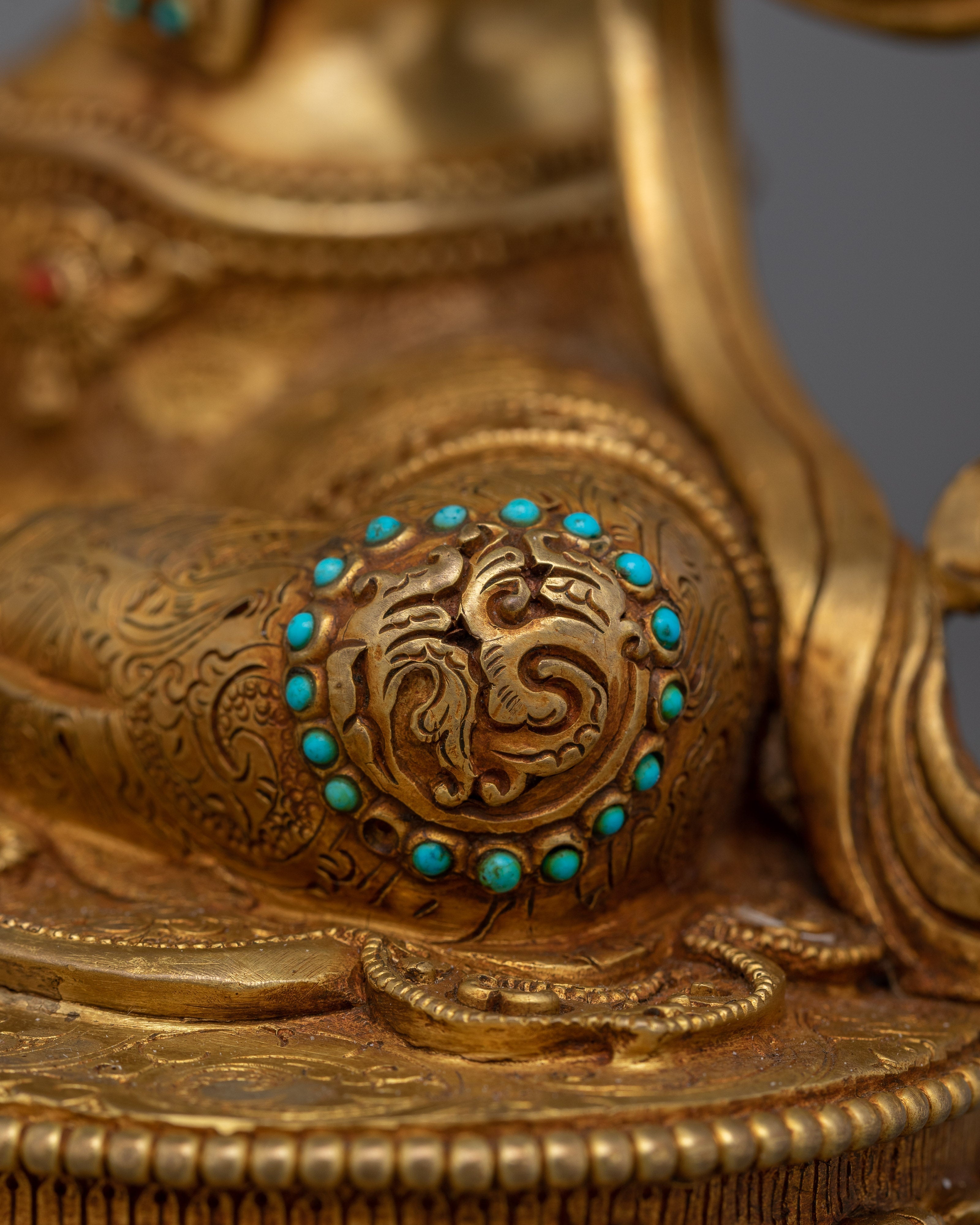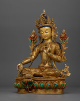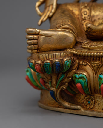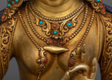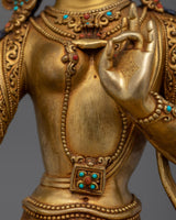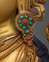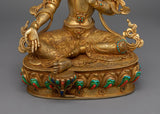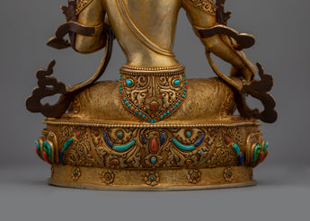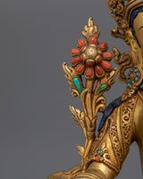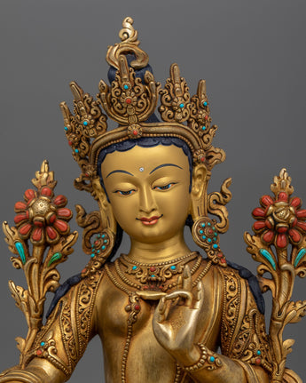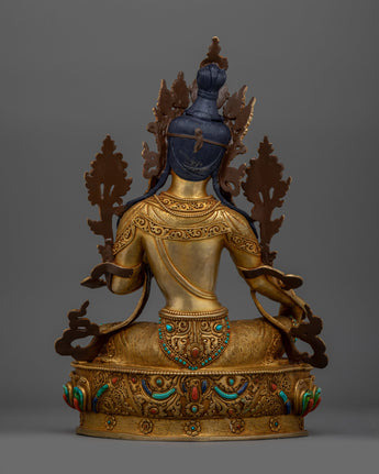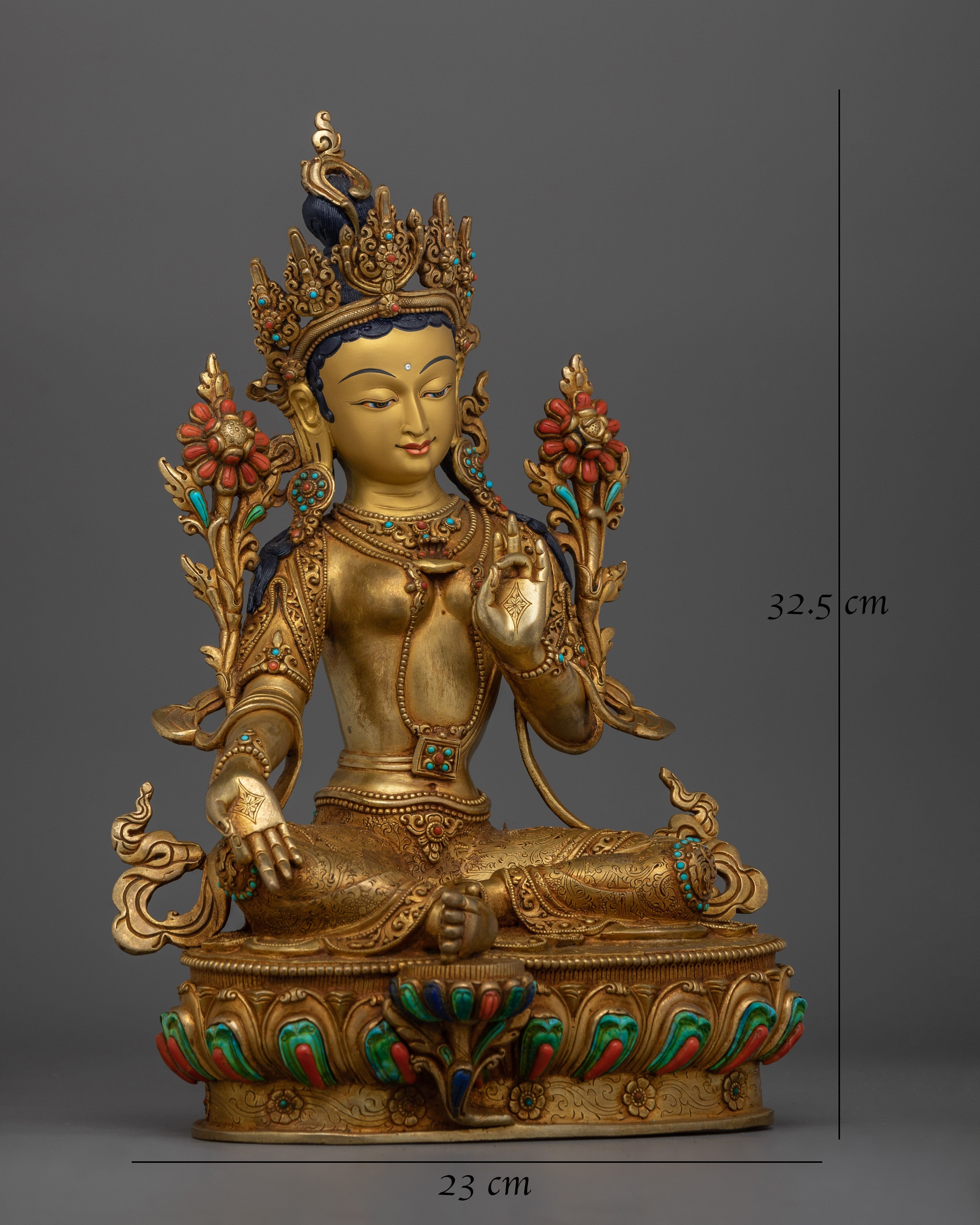 The exquisite Tibetan Green Tara sculpture from Tibet is a depiction of the well-known compassionate and graceful Bodhisattva, who is renowned for her capacity to bestow protection and promptly ease suffering. This finely made artwork which stands 12.8 inches (32.5 cm) tall, has a bright and holy atmosphere due to its triple layer 24K gold gilding, deeply engraved carving and copper body. Every feature is highlighted by delicate acrylic and gold paintings, and the figure is given a touch of religious elegance by hand-carved jewels. The statue is the ideal accent to any meditation or holy area, producing an atmosphere of compassion and calm thanks to its imposing 9.1-inch (23 cm) base.