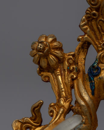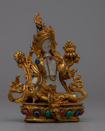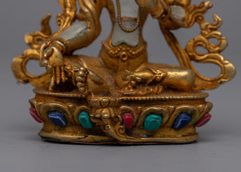 The Tibetan Green Tara Statue honors the respected deity's caring and protective traits. This statue, skillfully crafted on a copper body with a crystal stone composition, captures the essence of Green Tara, the Bodhisattva of compassion and deliverance from suffering. It is adorned with artificial gemstones such as coral and turquoise, reflecting Tara's vivid vitality and spiritual richness.